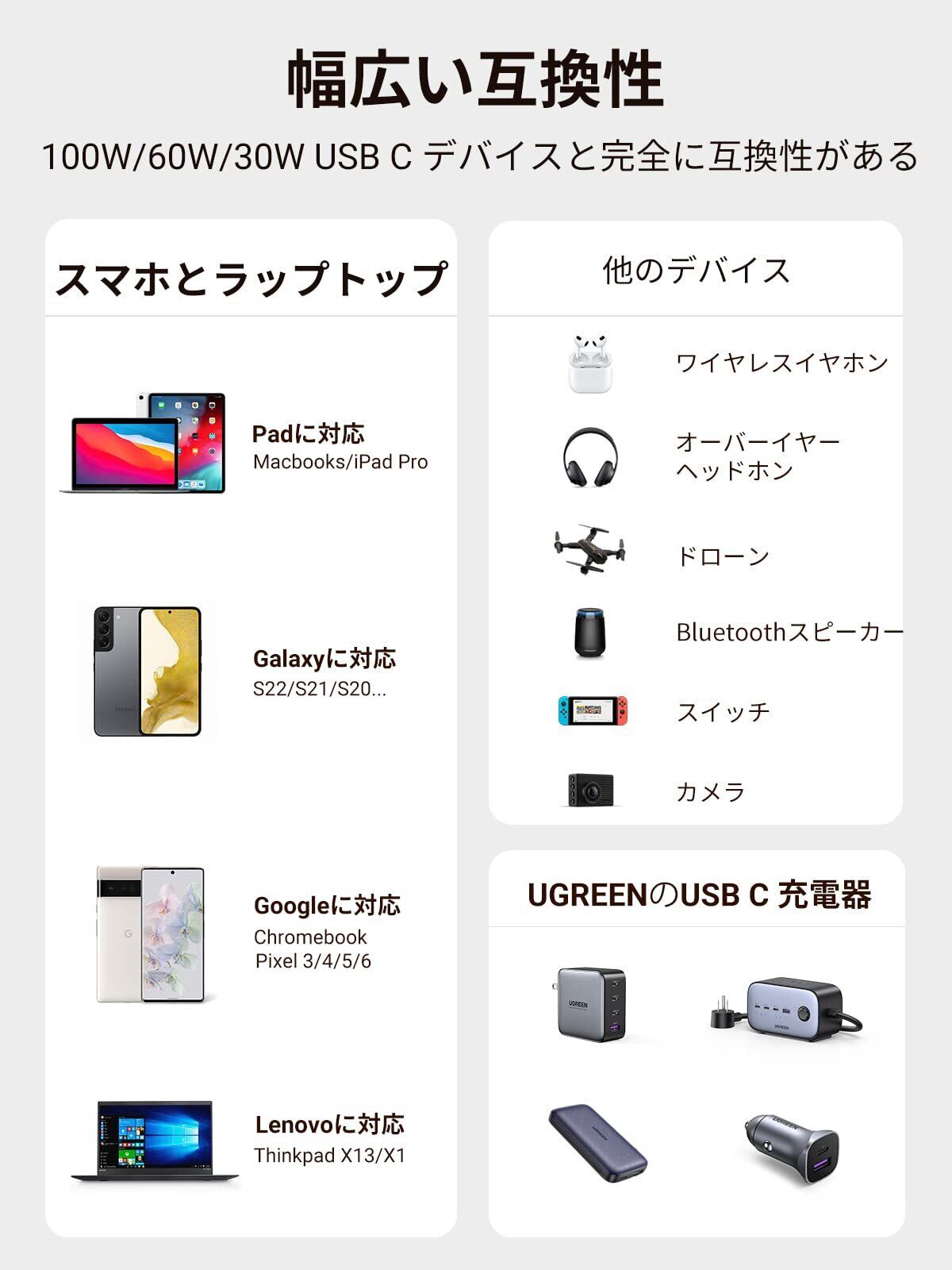 【幅広い互換性】 UGREEN usbc ケーブルはiPhone 16/15、MacBook Pro、Macbook Air、iMac、ChromeBook Pixel 、Dell XPS 、Moniteur 4k、 Galaxy S24、 Mate 20/ Mate 20 Pro/ P20/ P20 Pro/ Mate 10/ P10、HTC U11/ 10など様々なUSB type cデバイスに対応できます。スマホだけでなく必要の充電時間を短縮したい各種のタブレット、ノートパソコンなどの充電時間を大幅に減らせます。