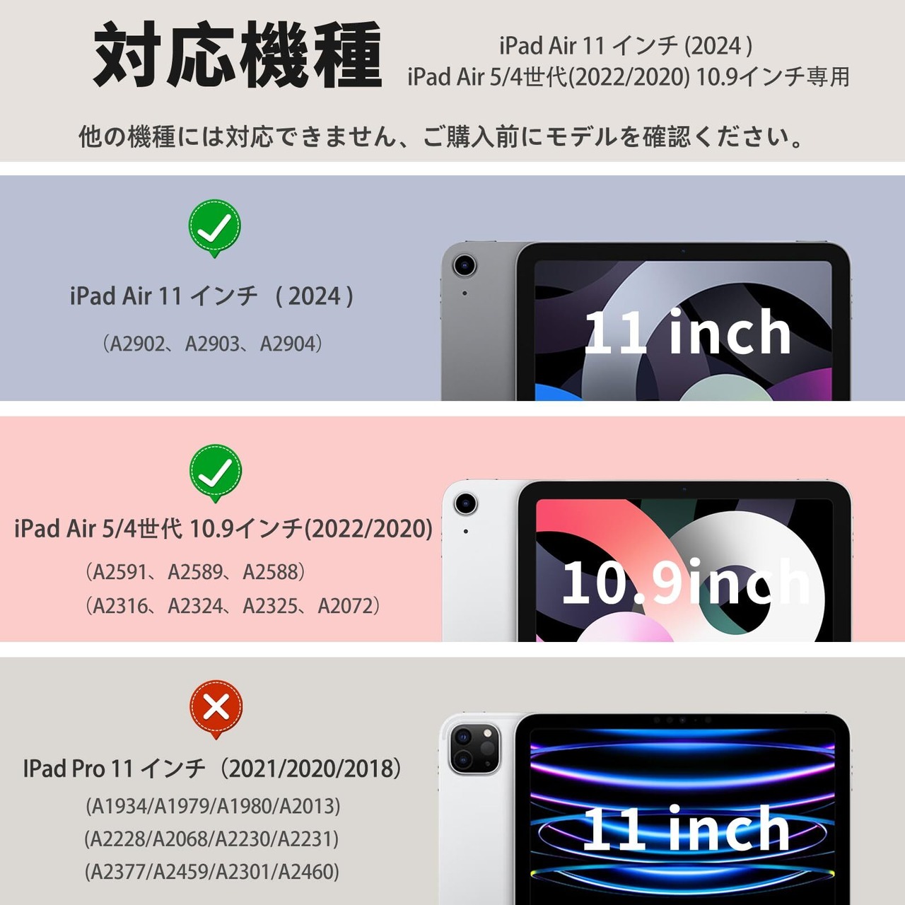 【互換性】iPad Air 11インチ (2024)、iPad Air 第5/4世代(2022/2020)専用です。 対応モデル:A2902、A2903、A2904、A2588、A2589、A2591、A2316、A2324、A2325、A2072 他のiPadモデルと互換性がありません。ご注文前にぜひモデルを確認ください。