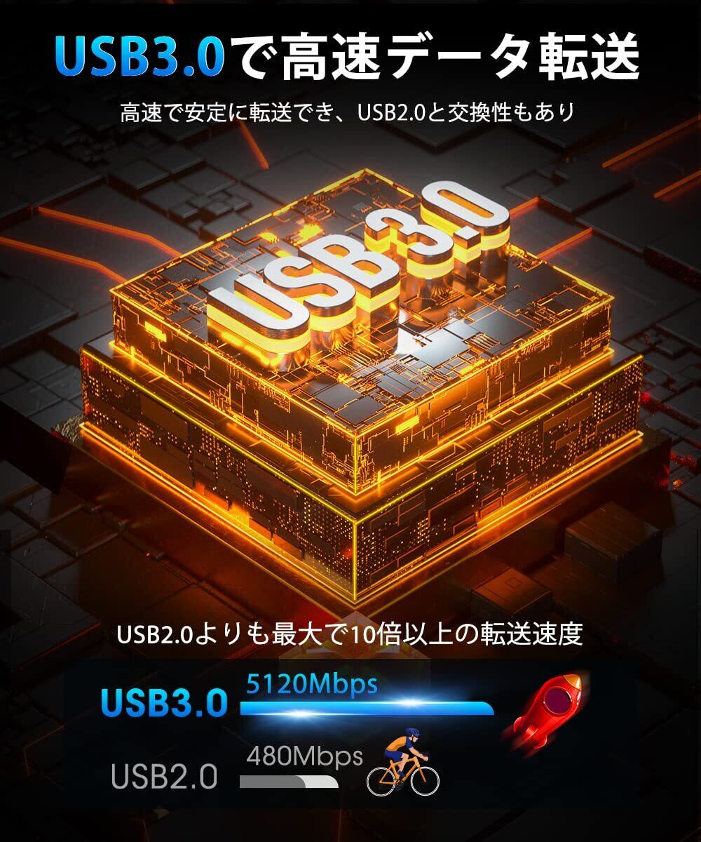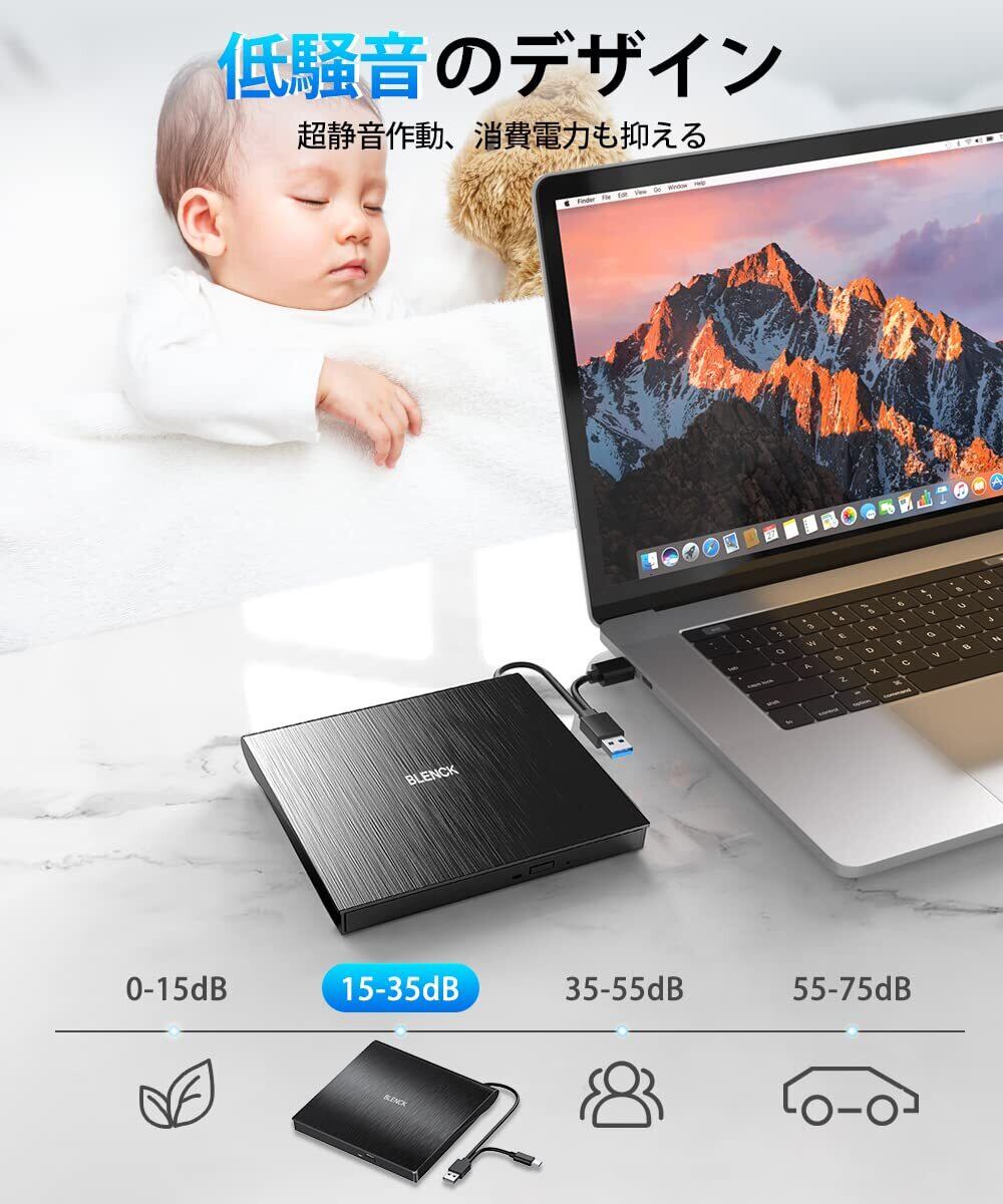 【最先端なUSB3.0を搭載】USBポートあるいはType-Cポートが接続すると、電源がONにして、DVDドライブが自動的に認識されます。USB2.0により約10倍の速度で転送が可能なUSB3.0を搭載した外付けCD/DVDドライブです。高速で転送できて、更にシステム保護機能があり、異常のシャッ夕ダウンによって、デ一夕が紛失される恐れが一切なく!パフォーマンスがより安定し、フォールトトレランスが強化されます。快適な使用体験を与えます。