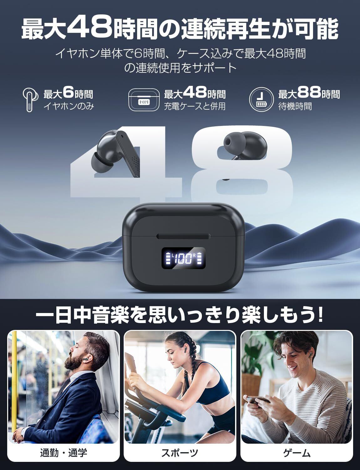 【朝から晩まで音楽を楽しめる】バッテリー性能大幅に向上しており、イヤフォン本体だけで連続6時間駆動でき、付属の収納ケースによる充電も加えると最大48時間になります。毎日の通勤通学や短期出張など、長時間の移動でも安心して快適に使えます。瞬時ペアリング技術を搭載することにより、1度ペアリングしているデバイスとはブルートゥースイヤホンを取り出した時点ですぐに接続します。片耳/両耳モードの切り替えも片方のイヤホンを出したり閉まったりするだけで簡単に対応いたします。さらに切り替え時には音楽を停止する必要がなく、スムーズに変更が可能です。ワイヤレスがもたらす自由をお楽しみください!