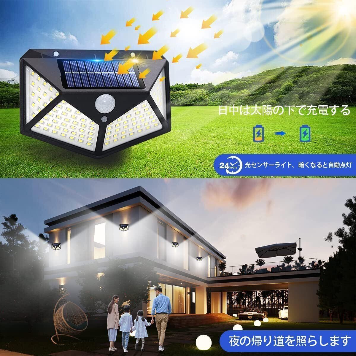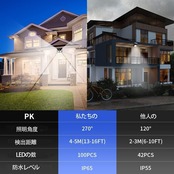 ご注意:受け取った後、使用する前に太陽エネルギーで充電してください。高輝度100LED・4面発光・270°照明】屋外防水ソーラーライトは100個高品質LEDが揃え、発光効率の高い上に、4面発光で照明角度が270°以上に達します。色温度は6500K、昼光色で昼のように所々を照す。発熱が少なく、低赤外線・低紫外線で虫を寄せ付けにくい。人感センサーライトの検出角度が160°になったので、ほぼすべての角度から不審者や犯罪者を威嚇できます。屋外に設置して防犯対策効果が抜群です。(設置前に、できるだけ日当たりの良い場所を選んでください)