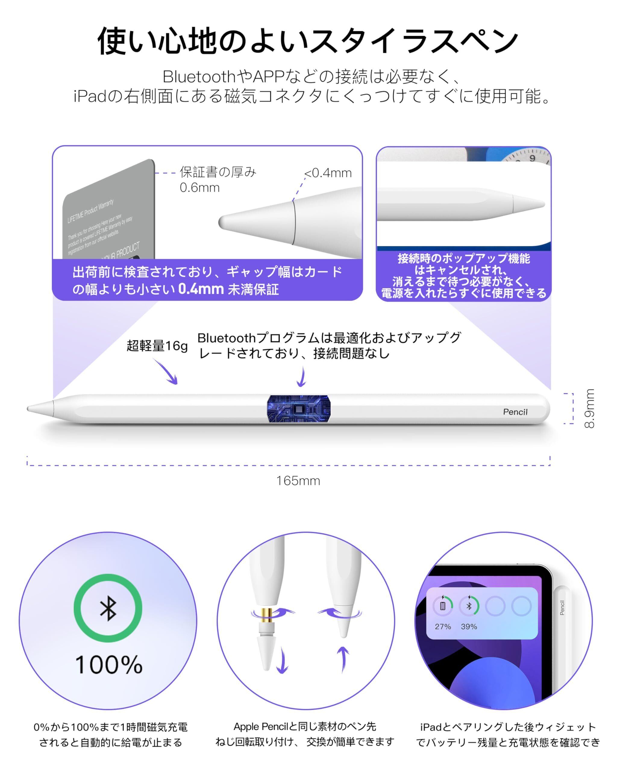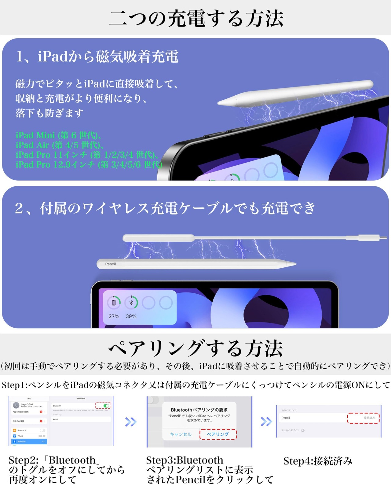 【対応iPad機種】iPad Pro 12.9インチ(第3/4/5/6世代)、iPad Pro 11インチ(第1/2/3/4世代)、iPad Air(第4/5世代)、iPad Mini(第6世代) のみに対応しています。新型iPad Pro11 インチ/13インチ(M4)、新型iPad Air 11インチ/13インチ(M2)、iPad Pro 12.9インチ(第1/2世代)、iPad Pro 10.5インチ、iPad Pro 9.7インチ、iPad Air(第1/2/3世代)、iPad Mini(第1/2/3/4/5世代)、iPad(第10/9/8/7/6/5/4/3/2/1世代)には非対応で、ぜひ誤購入しないでね。パッケージ内容: Pencilx1、日本語マニュアルx1、シリカゲル生地の収納ケースx1、予備のペン先x2、専用的なワイヤレス充電ゲーブルx1。