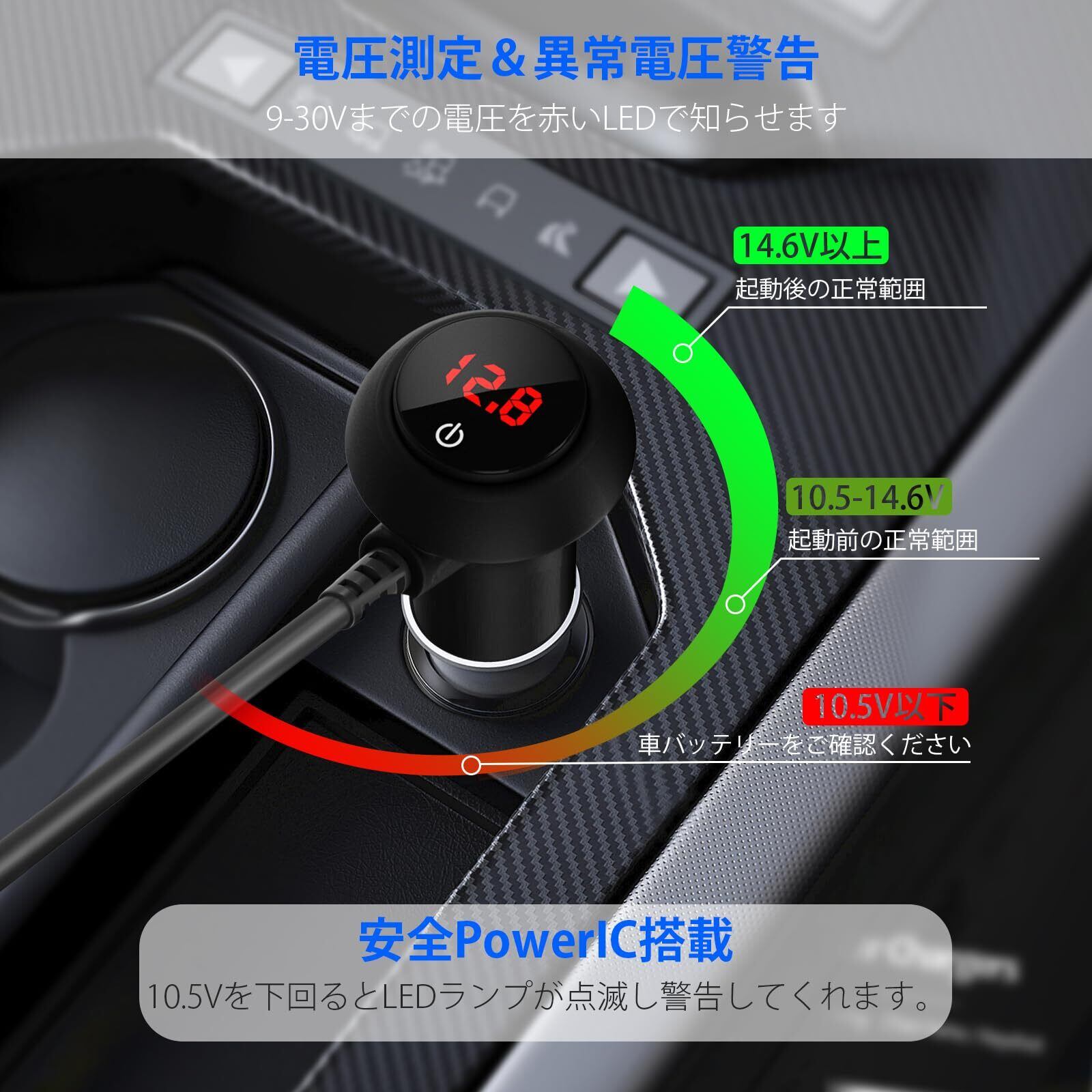 【自動電圧検出・スマートIC安全保護】LEDディスプレイでいつでもお車の電圧をご確認いただけます。9-30Vまでの電圧を見やすいレッドLEDで知らせてくれます。10.5Vを下回るとLEDランプが点滅して警告します。機器に合わせて適切な出力に調節するスマートICを搭載し、過電圧・過電流・ショット・過熱防止など、多重保護システムを搭載するため、安心してご使用いただけます。