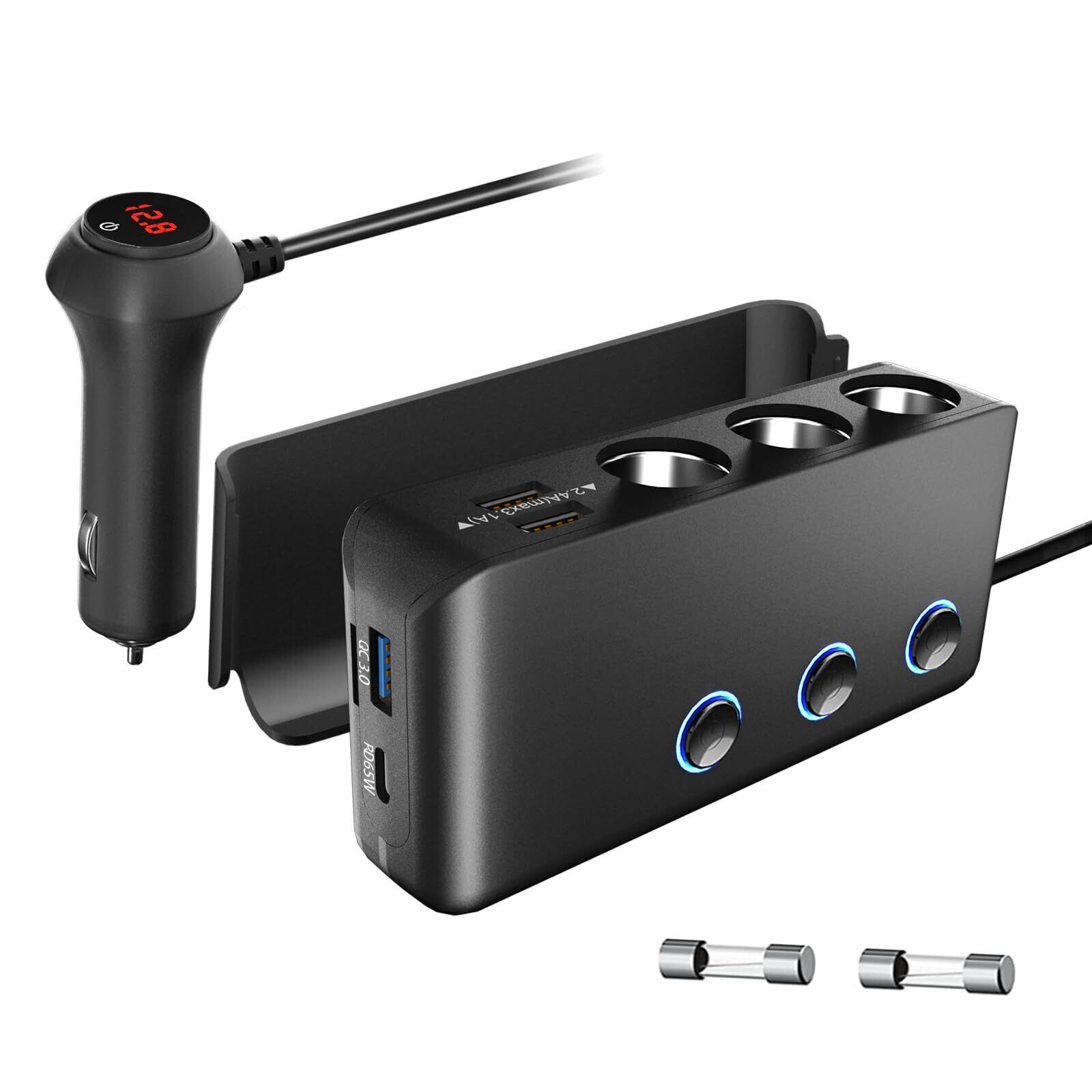 【数量限定】Elekeed シガーソケット 3連 【Quick Charge 3.0 & PD65W 搭載】 急速充電 増設 カーチャージャー 4ポート付き USB (最大8.5A/5V) スマートIC 12-24V車 独立スイッチ 電源ソケット 分配器 電圧測定 赤LED搭載 1mケーブル 取り替えヒューズ2個付き | ニコニコSHOP