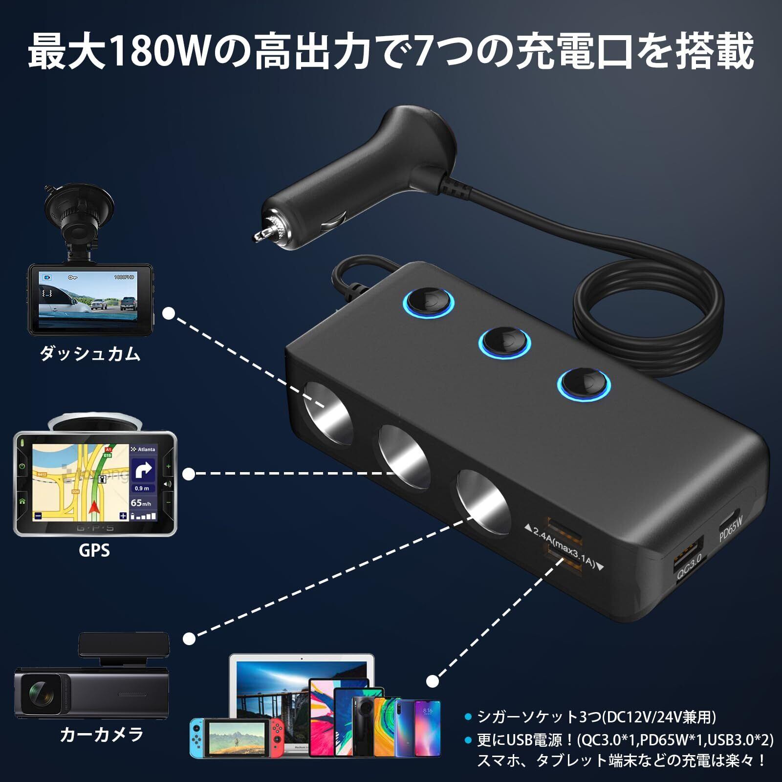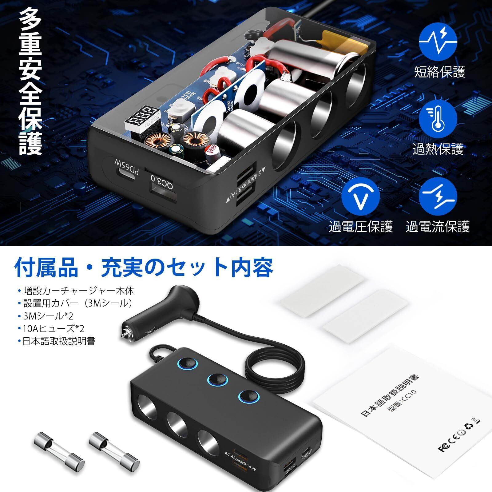 特徴 スマートIC安全保護, 3連シガーソケット, 12-24V車対応, QuickCharge3.0とPD65W, 自動電圧検出, 省電力スイッチON/OFF