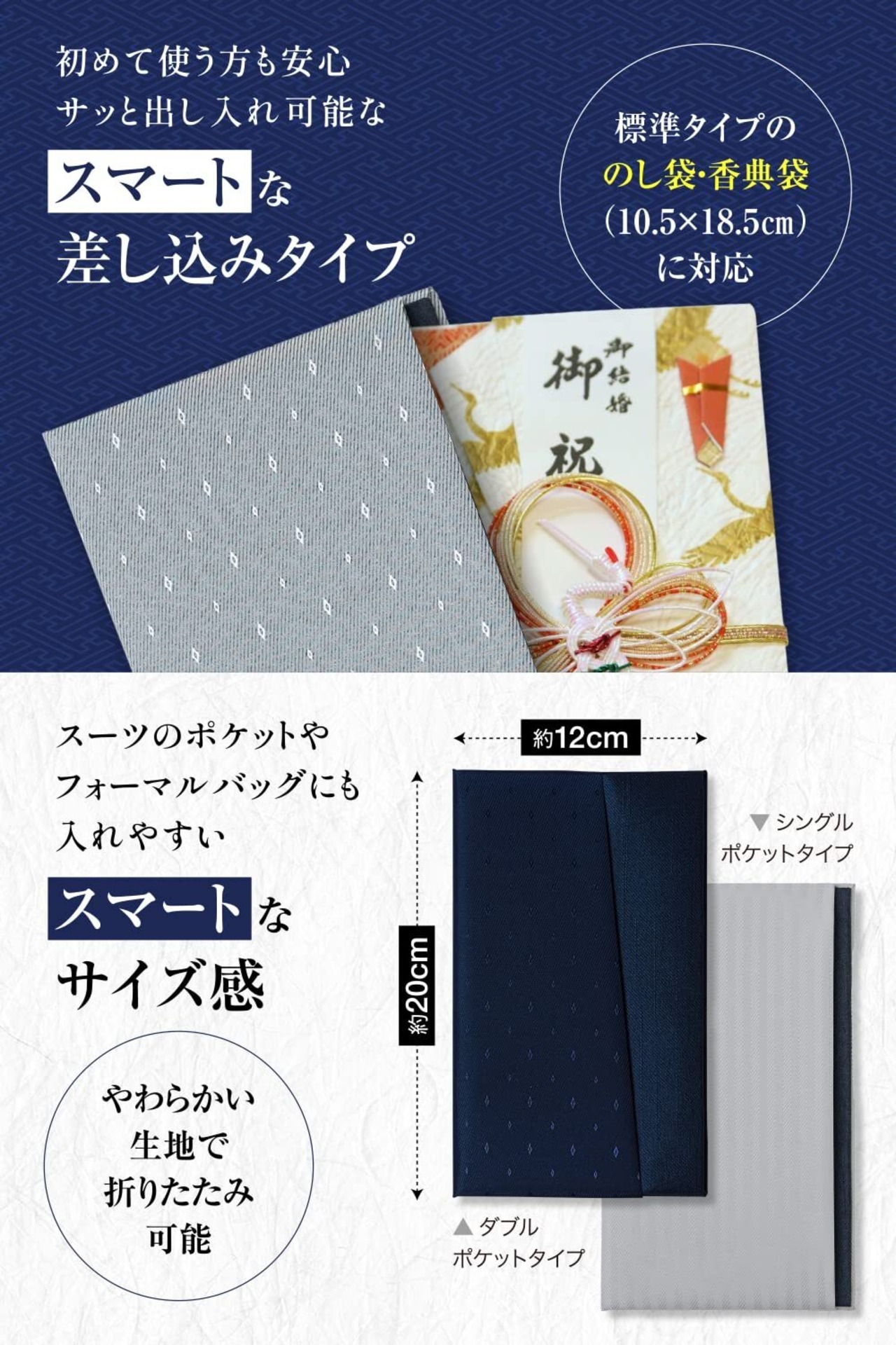 【差し込みタイプ】スマートな出し入れがしやすい横から差し込むタイプのふくさです。2つの差し込み口があり、祝儀袋や 香典袋と+1を収納できます。一般的な祝儀袋や香典袋(10.5cm×18.5cm)に対応しています。