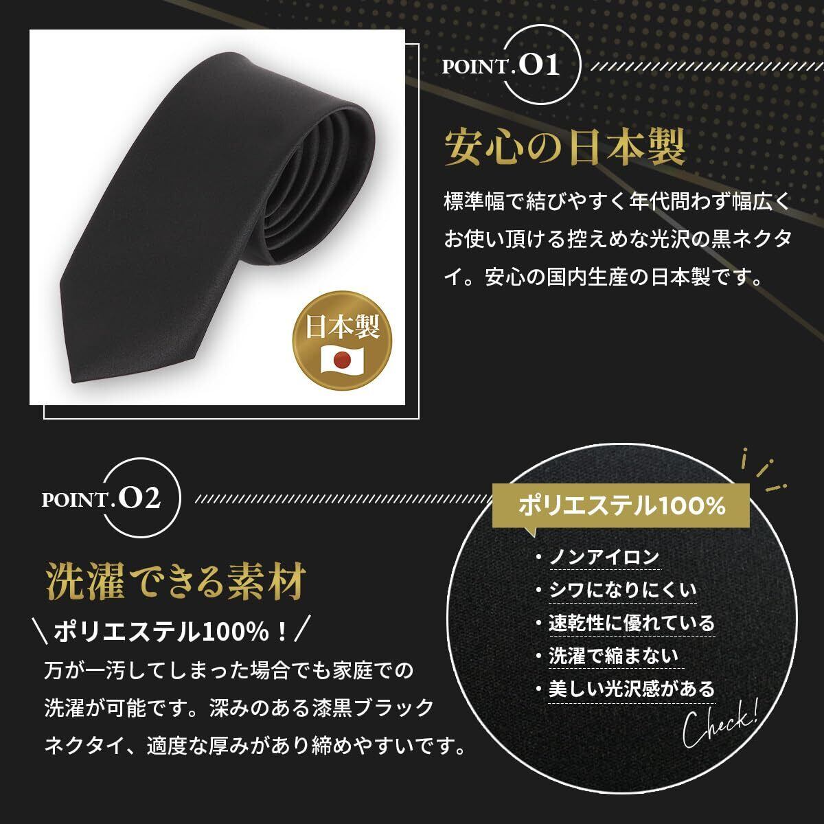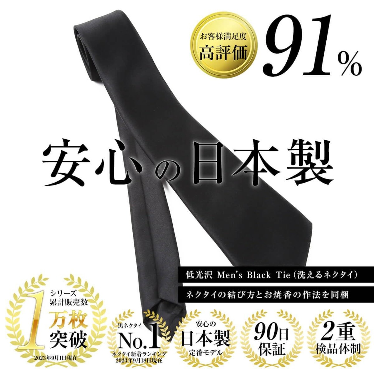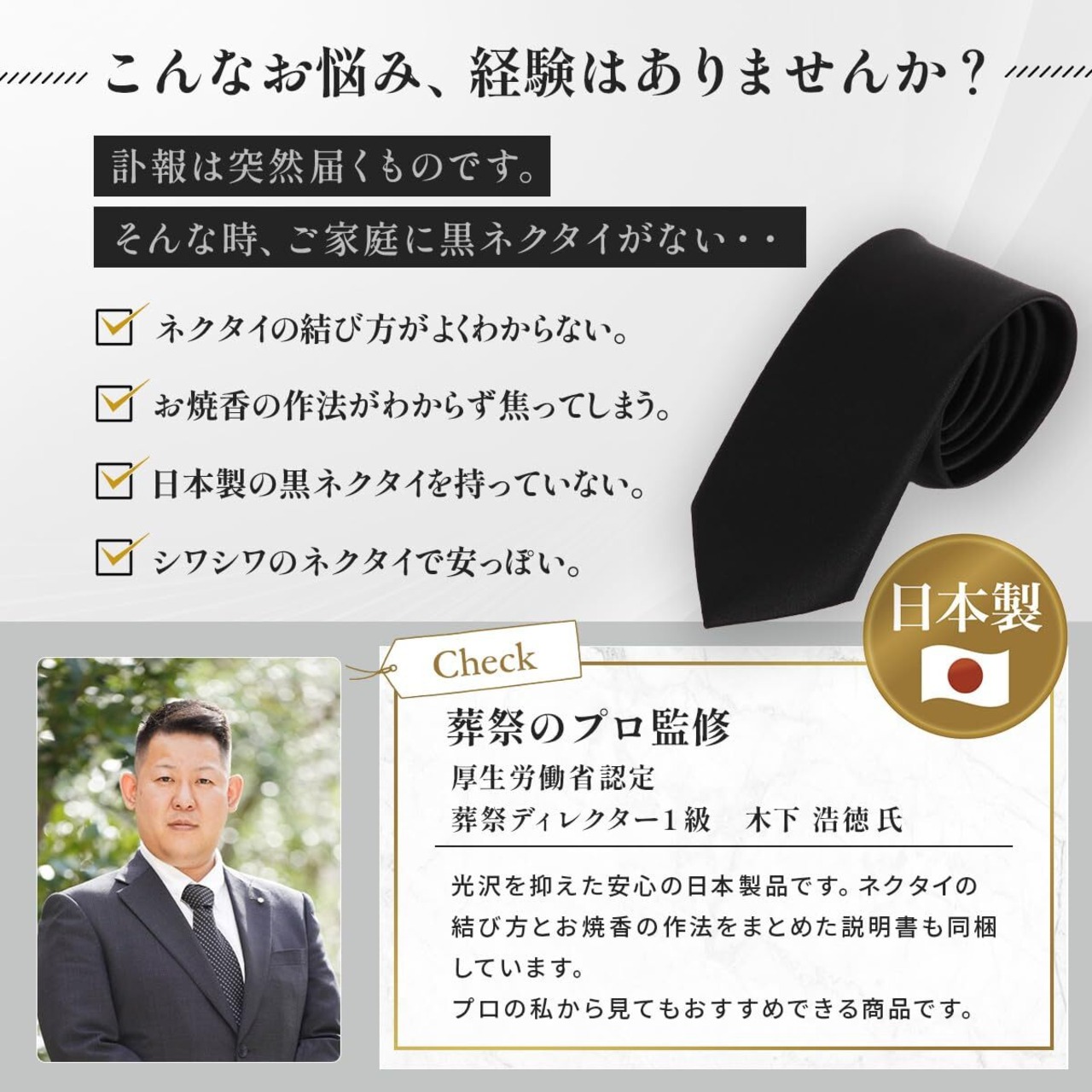 【 厚労省認定 葬祭プロ監修 】葬祭ディレクター1級 木下浩徳氏監修。【 サンケイスポーツに掲載されました 】 【 安心の日本製 】標準幅で結びやすく年代問わず幅広くお使い頂ける控えめな光沢の黒ネクタイ、安心の国内生産の日本製です。