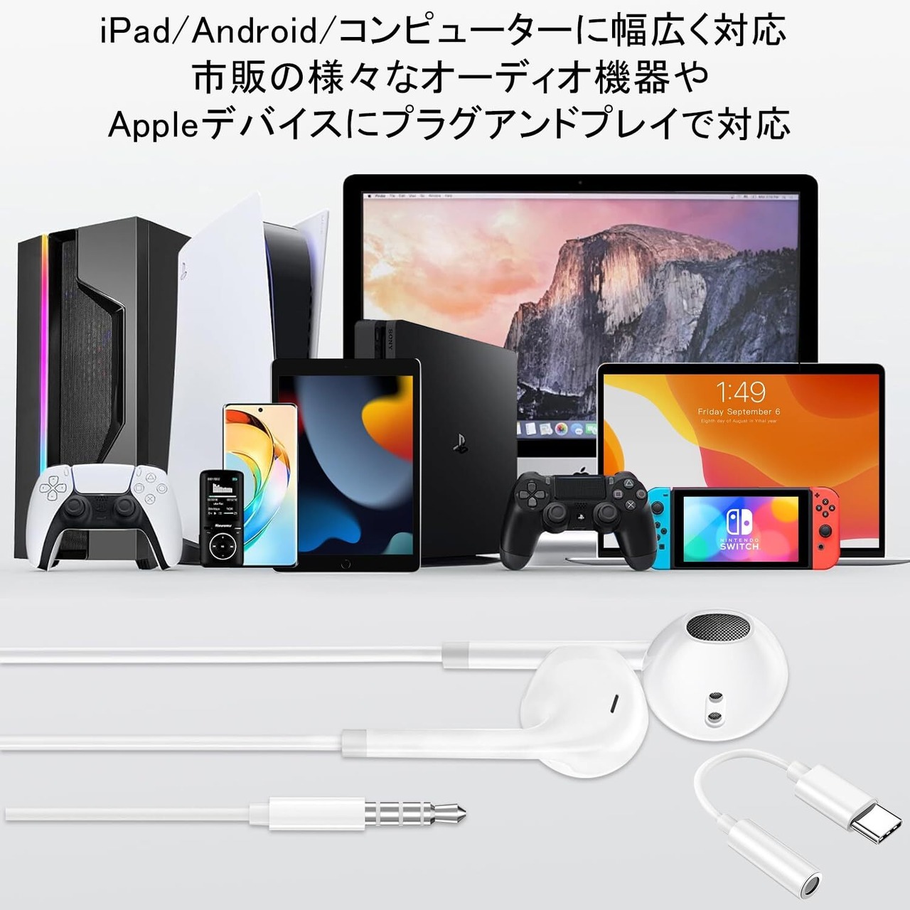 【2025新版】イヤホン 有線イヤホン 3.5mmジャック HIFI音質 音量調整 重低音 ノイズキャンセリング マイク付き 通話可能 ハイレゾ クリア通話 音量調節 ステレオイヤフォン ヘッドホン(USB C to 3.5 mm メスイヤホンジャックアダプター 付き)