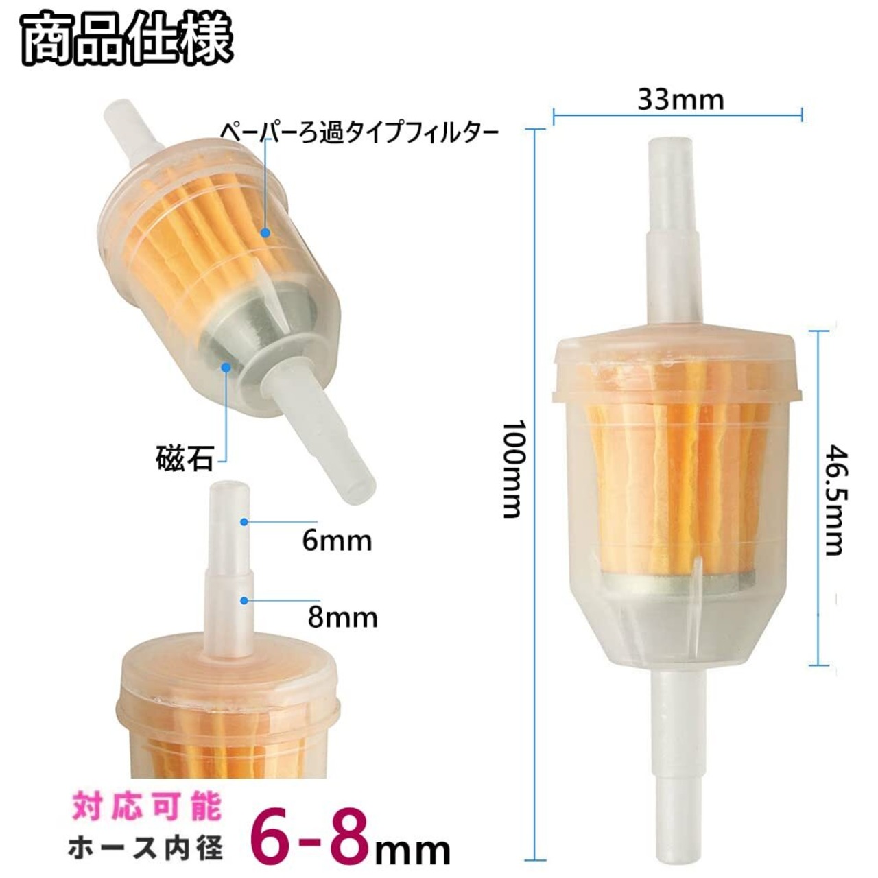 【商品の内容】汎用タイプガソリンフィルター*5個セット。サイズ:本体の長さ:46.5 mm;本体の直径:33ミリメートル;全長:100mm。 材質:プラスチック、紙&金属。
