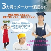 【丈夫な生地&しっかりした縫製】丈夫な生地で縫製がしっかりしているので、長くご愛用いただけます。 【3カ月のメーカー保証だから安心】smile modeのエプロンは品質管理を徹底しておりますが、万が一商品に不都合があった場合には弊社負担で交換または返品とさせていただきます。 【同カラー同素材の三角巾も販売中】ご要望により同カラー・同素材の三角巾も販売中。セットで購入すればさらにスタイリッシュに!