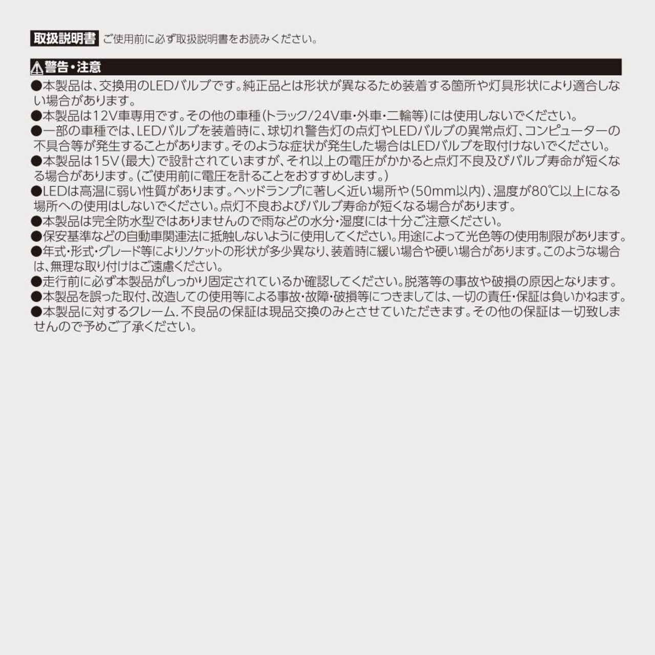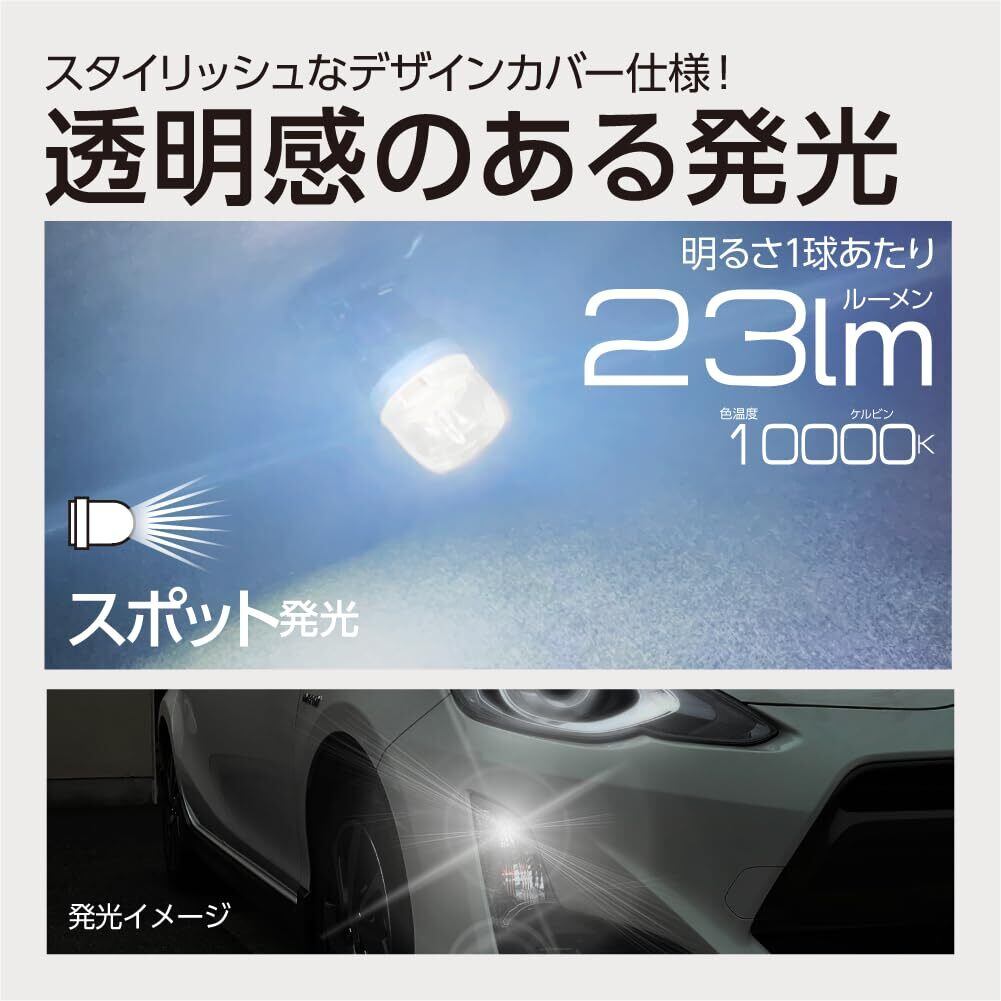 スタイリッシュなデザインカバー仕様(車検基準対応)用途:ポジション球、型:T10、ライト色:ホワイト電圧:DC12V車専用(ハイブリット車、EV車、アイドリングストップ車も対応)LED:SMDチップ4灯、色温度:10000K(ケルビン)、明るさ:23lm(ルーメン)照射タイプ:スポット、極性:無極性、カバー:クリア、入数:2個※本製品は12V車専用です。その他の車種(トラック24V車、外車、二輪等)には使用しないでください。※本製品は交換用のLEDバルブです。純正品とは形状が異なるため装着する箇所や灯貝形状により適合しない場合があります。