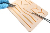保護メッシュ:ユーザーエクスペリエンスを向上させ、縫合パッドの耐久性を上げるために、保護メッシュをなるべく表面に近くなるよう、一番目の皮膚を模した層に配置しました。これによって縫合パッドが裂けるのを防ぐため、特に初級の縫合トレーニングを行う初心者向けです。プレカット傷がデザインされています: 縫合パッドはさまざまなトレーニングに合わせて、直線の傷、曲がった傷、剥皮創、裂創、刺創などがあります。