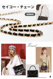 【メイン素材】合成皮革(PUレザー)のショルダーストラップ、軽量なメタルチェーンを外側に付け、バッグ全体に光沢感を与え、エッジの効いたスタイルに仕上げています。