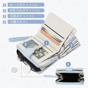 実用性収納力:カードポケット×5、透明写真ポケット×1、お札入れポケット×1、小銭入れ×1。5箇所カードホルダーがあるので、カードクレジットカード・ポイントカード・IDカードなど様々なカードが収納できます。お札入れは中が広がっている、20枚以上な現金が収納できます。小銭入れには仕切りあり、コイン・キーなど小物が収納できます。カード入れ、お札入れ、小銭入れは全部付いている大容量多機能二つ折り財布です。