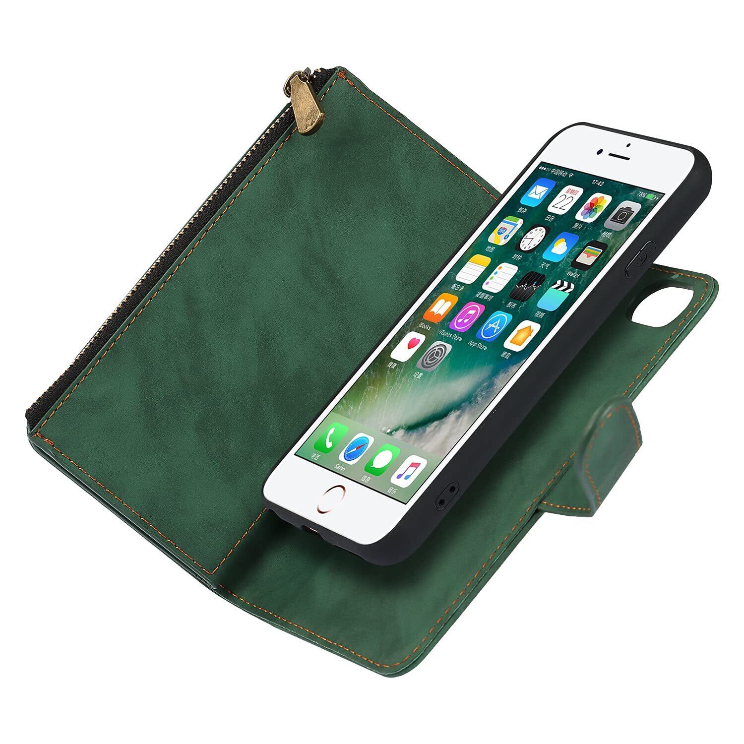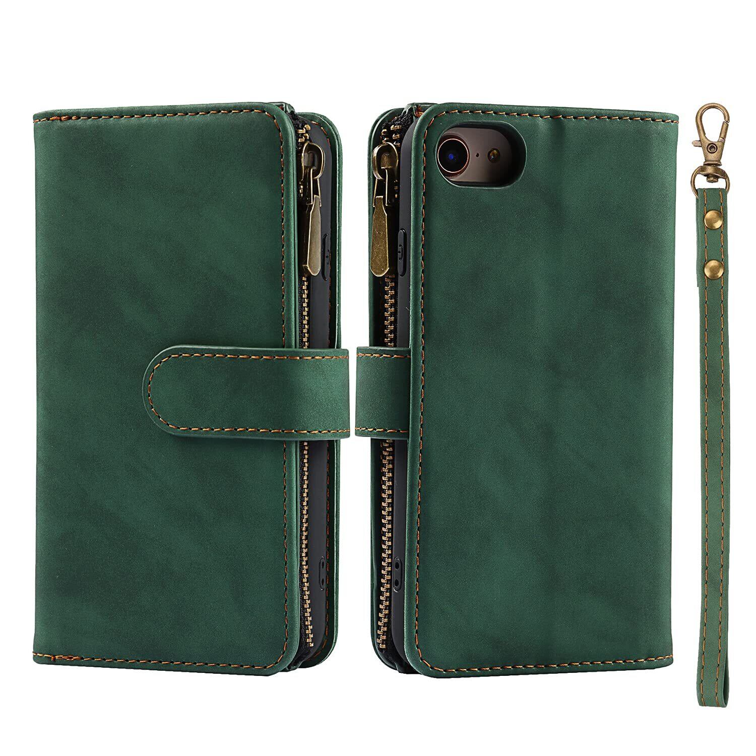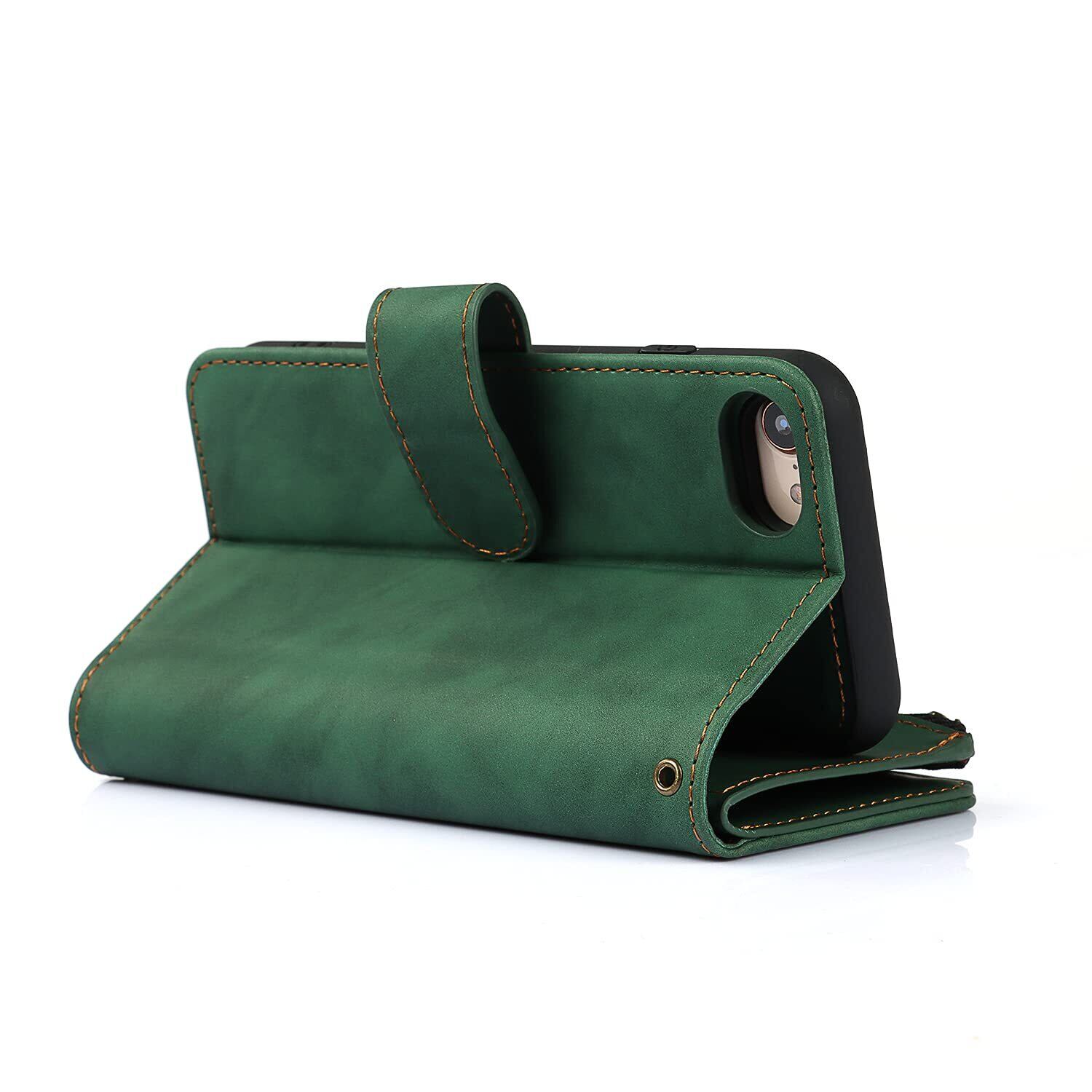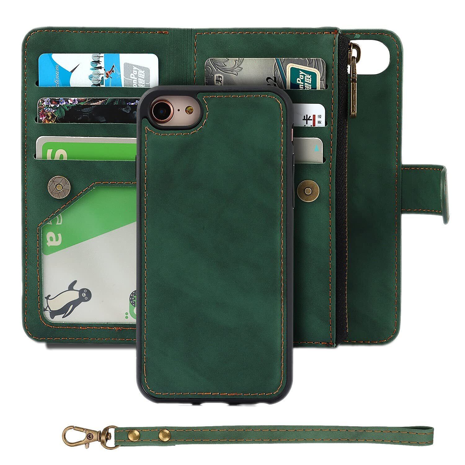 Pelanty iPhone SE 2022 第3世代/7/8/6/6S ケース分離式 iPhone SE 2020 第2世代 2in1 ケース手帳型 背面カバー 縄掛け マグネット 取り外し自由 両用2way 小銭入れ札入れ大容量 財布型カード収納 携帯カバー 合成PUレザー+TPU スタンド機能 ストラップ付き 耐衝撃 アイフォン6/6S/7/8/SE2/SE3(グリーン)