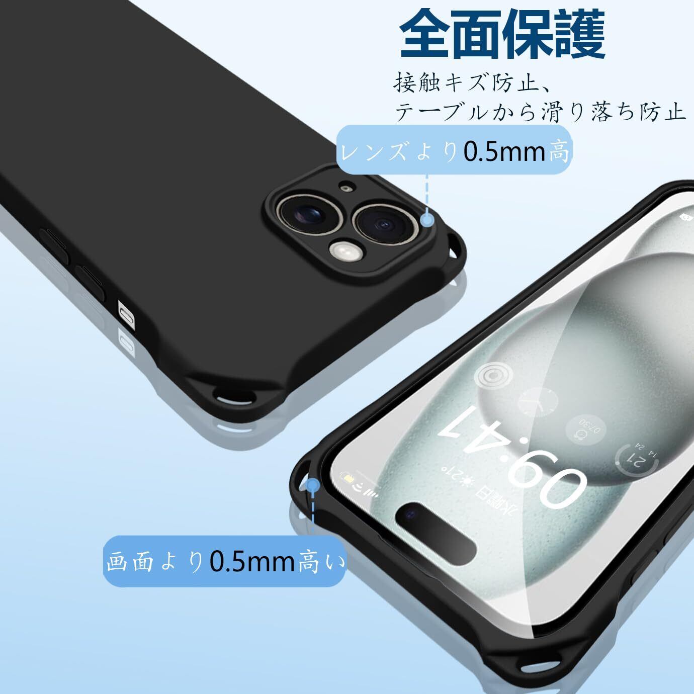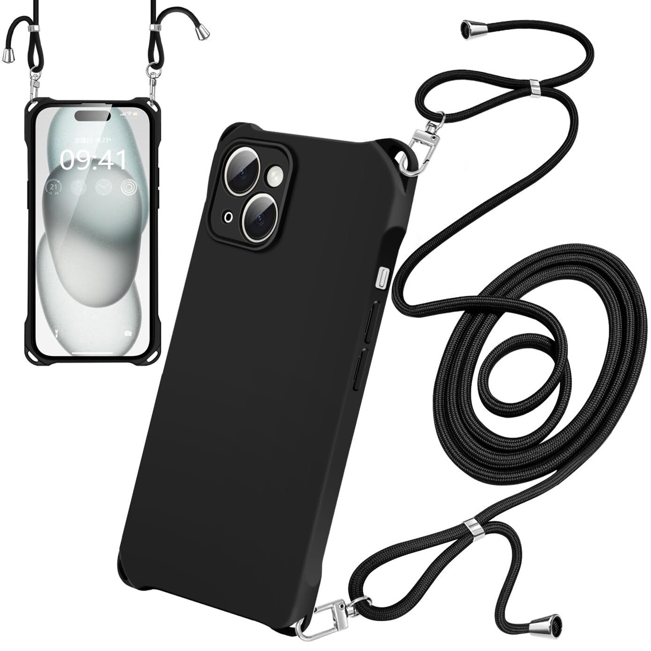 iPhone15 Plus ケース ネック ショルダー ストラップ付き スマホ シリコン 紐付き 耐衝撃 アイフォン15Plus カバー 斜めがけ 織りストラップ付き 調節可能なショルダー クロスボディ ネックレス ファッションデ 保護(ブラック)