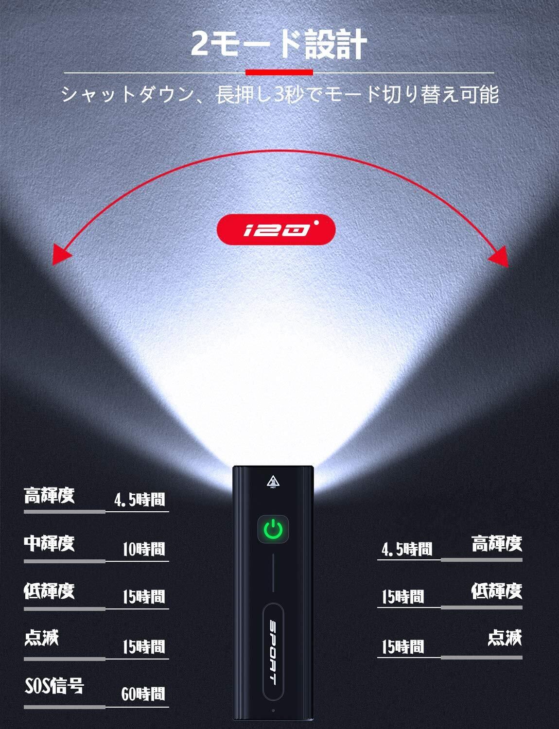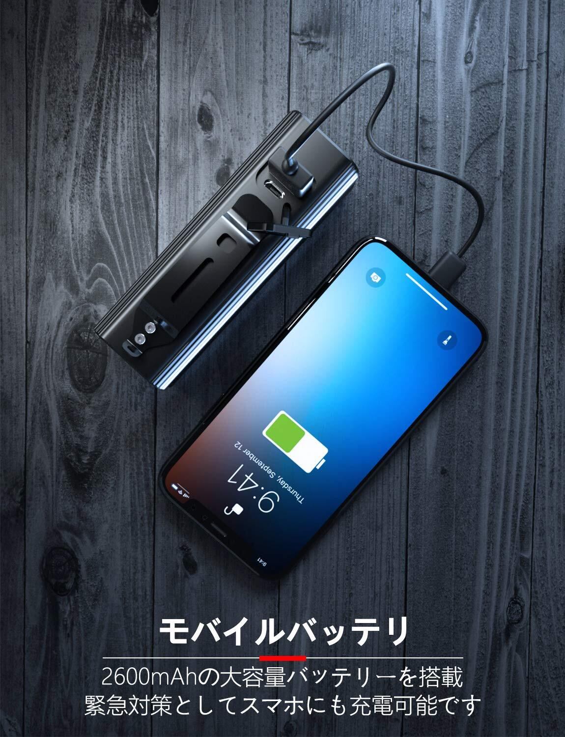 【USB充電式&スマホ充電機能付き】2600mAhの大容量自転車ライトなので、最大30時間(ロービームモード)連続でご利用いただけます。自転車ライト充電式なので繰り返し充電することができ、電池の交換が不要です。モバイルバッテリー機能が付いているから、バッテリーが足りない場合には、スマホを充電できて、アウトドアでの非常時に、大変重要です。