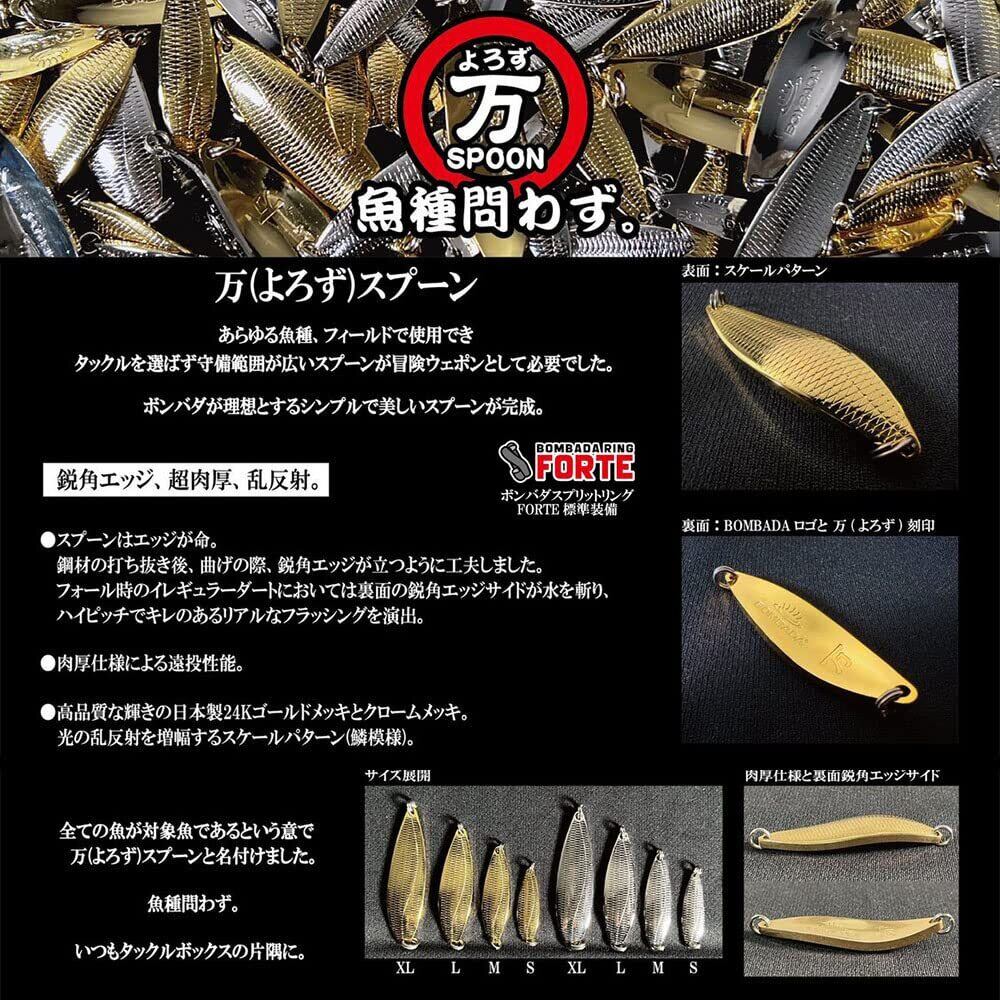 ●あらゆる魚種、フィールドで使用できタックルを選ばず守備範囲が広いスプーンが冒険ウェポンとして必要でした。ボンバダが理想とするシンプルで美しいスプーンが完成。●鋭角エッジ、超肉厚、乱反射。●スプーンはエッジが命●鋼材の打ち抜き後、曲げの際、鋭角エッジが立つように工夫しました。フォール時のイレギュラーダートにおいては裏面の鋭角エッジサイドが水を切り、ハイピッチでキレのあるリアルなフラッシングを演出。●肉厚仕様による遠投性能●高品質な輝きの日本製24Kゴールドメッキ と クロームメッキ●光の乱反射を増幅するスケールパターン(鱗模様)●全ての魚が対象であるという意で「万(よろず)スプーン」と名付けました。魚種問わず。いつもタックルボックスの片隅に。