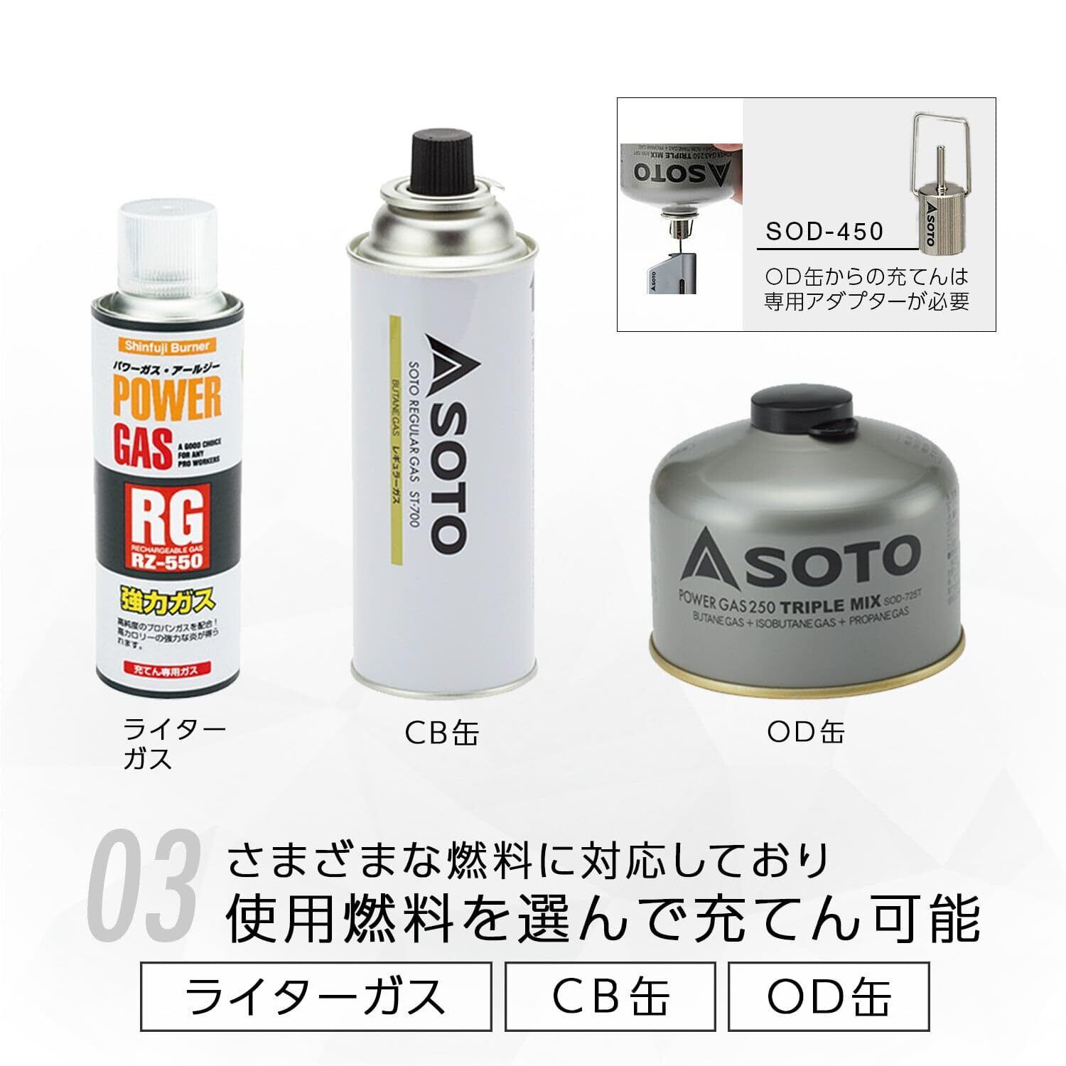 ●燃料は充てん式。カセットガスからの充てんもできる。 ※ボンベは別売 ※出荷時ガスの付属・同梱・充てんはございません。