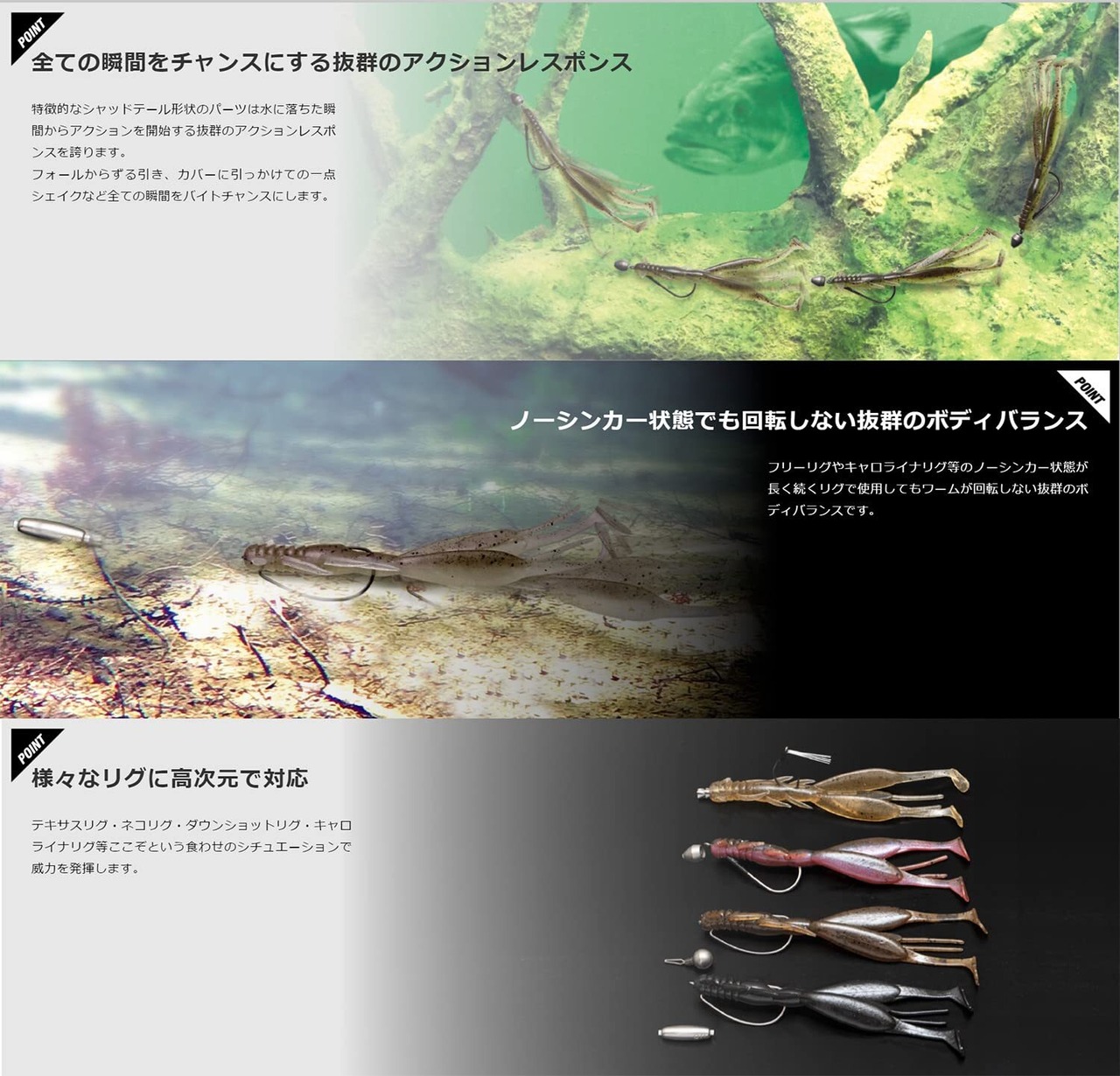 特徴的なシャッドテール形状のパーツは水に落ちた瞬間からアクションを開始する抜群のアクションレスポンスを誇ります。