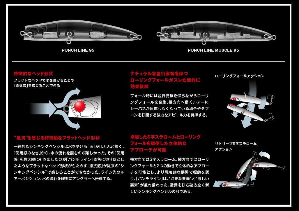 1ozのパンチラインは、シリーズ中最も重いモデルとなるが、ウェイトアップにありがちである大味な味付けではない。飛距離は当然ながら、比較的足場の高いゲームが多い磯や防波堤などでも水平フォールの姿勢を維持できるようなウェイト配分となっており、ステイさせて食わせる事が可能。激流ディープやサラシの中における操作性も高いが、通常のミノーではターゲットまで届かないような状況、例えば河川やサーフなどで見られる遠投必須の場合なども含め、場面を問わずに使用する事も出来る。[全長] 95mm[重量] 28g[タイプ] ファストシンキング[アクション] S字スラローム+ローリングフォール[フック] #4