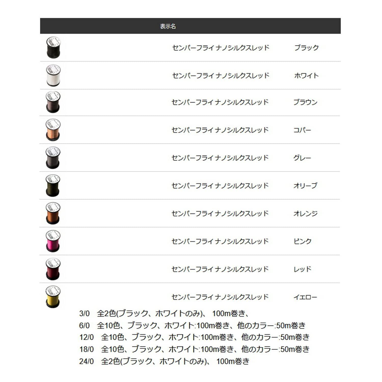 12/0 全10色、ブラック、ホワイト:100m巻き、他のカラー:50m巻き