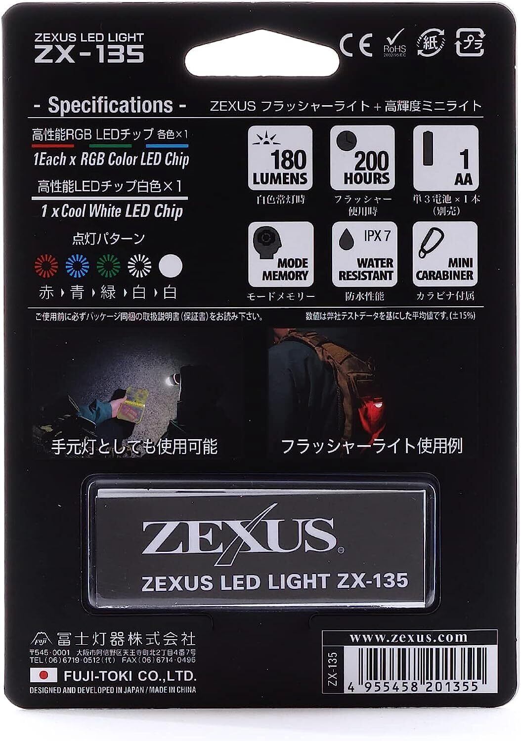冨士灯器 ZEXUS(ゼクサス) LEDライト ZX-135 (FLASHER) [最大180ルーメン フラッシング使用時間:最大200時間 IPX7相当]