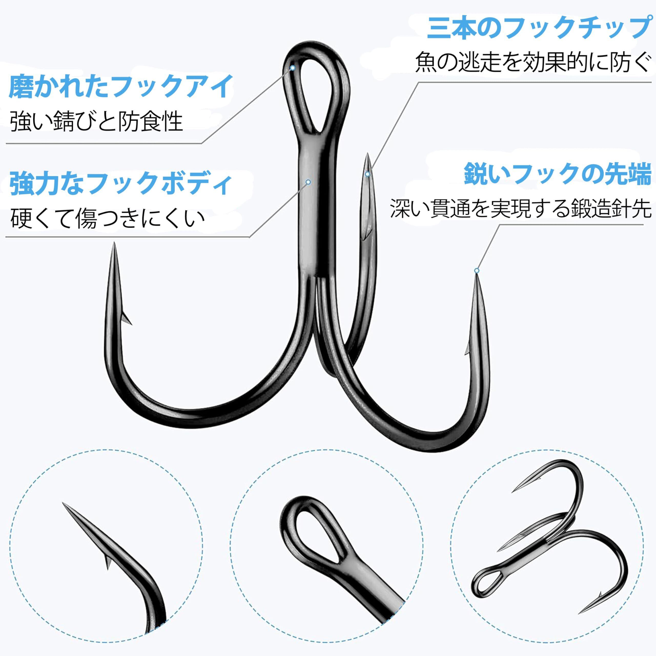 注意喚起:乗合販売出品者(弊社以外)から購入のものは偽物です。Amazonのアフターサービスはご提供いただけません。ご確認をよろしくお願いします。【圧倒的な高コスパ】100本入りの大量のトレブルフックなので、圧倒的な低価格 が実現しました。消耗品だから、錆、紛失や根掛かりなどは心配せず使用できます。「100円のジグに高級トレブルフック付けてロストだな」と思ったルアー初心者と使用頻度高い方におすすめです!