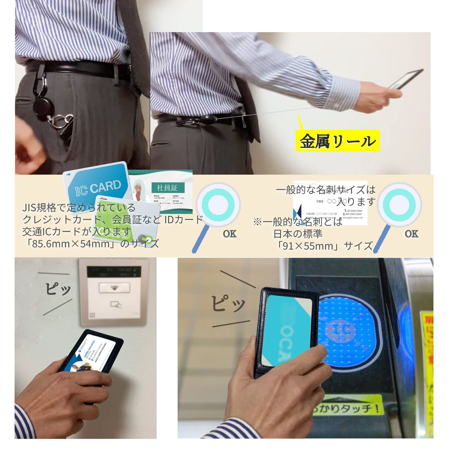 【使用と特徴】JIS規格で定められているカードサイズ 5.4cm×8.6cmのクレジットカード、交通系ICカード(ICOCA・PASMOなど)、社員証、免許証などが入ります。一般的な名刺サイズ 55×91mmも入ります。金属リールは伸縮が約55㎝ほどあり長めなのでセキュリティーゲートは かがまずに楽にタッチできます。IDカードを使っての入退室管理システムなどにお使いいただけます。中に入っている台紙1枚は顔写真を貼ったり、ナンバー、名前、その他の情報などを直接記入する事ができます。
