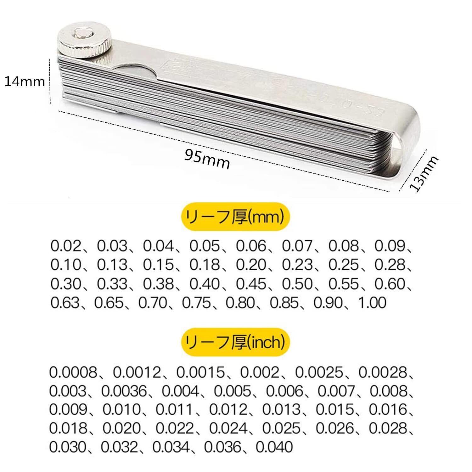 【ゲージサイズ(インチ)】0.0008、0.0012、0.0015、0.002、0.0025、0.0028、0.003、0.0036、0.004、0.005、0.006、0.007、0.008、0.009、0.01、0.011、0.012、0.013、0.015、0.016、0.018、0.02、0.022、0.024、0.025、0.026、0.028、0.03、0.032、0.034、0.036、0.04。
