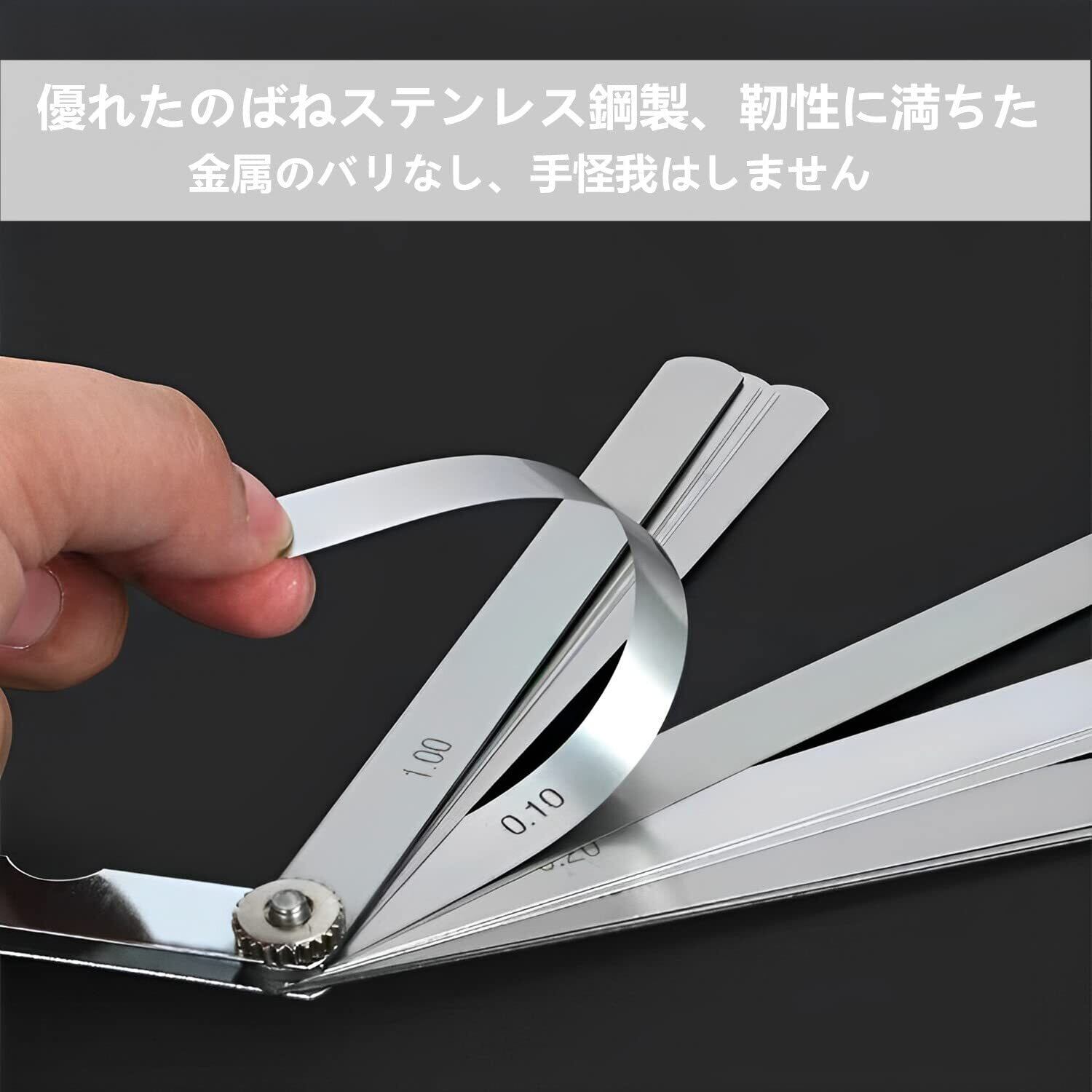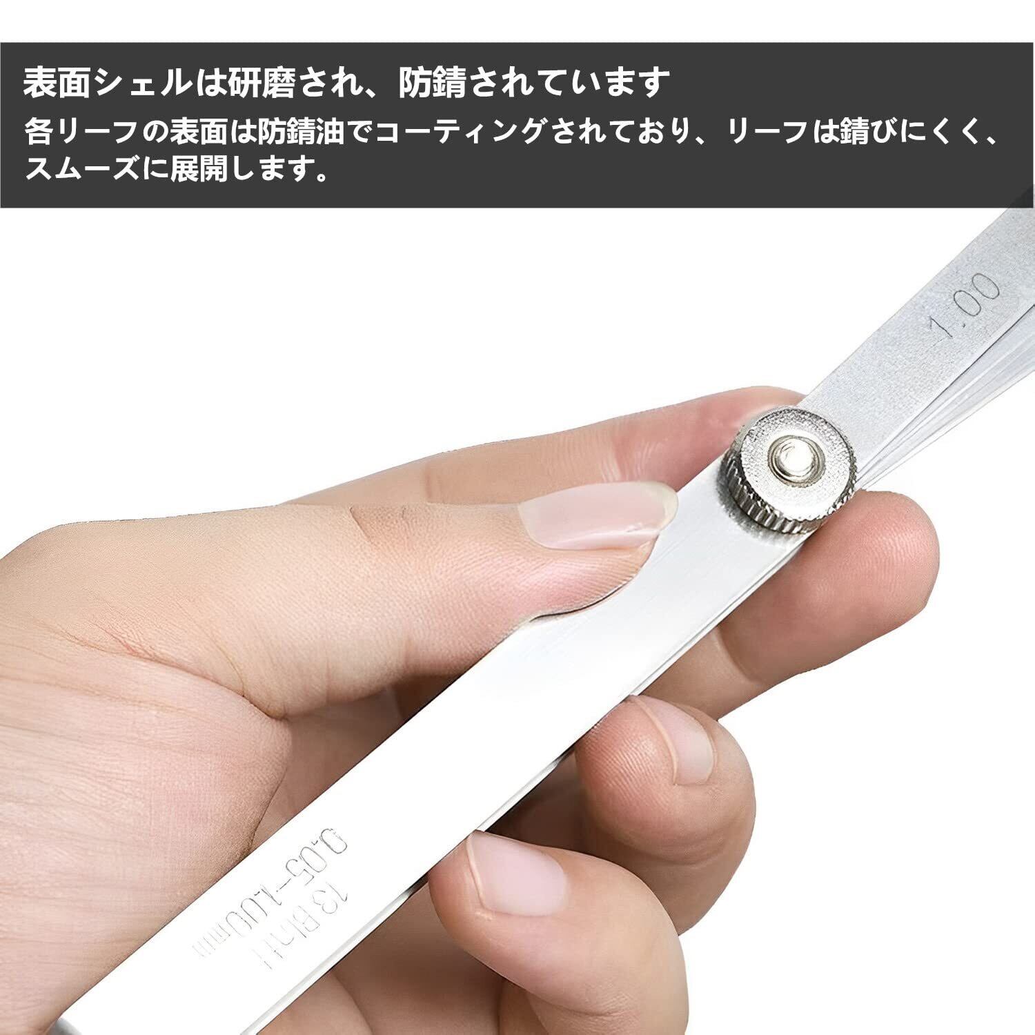 【ご注意】新品のシックネスゲージ表面に防錆油があります。この防錆油により、シックネスゲージは錆びず、簡単に開けられます。お使いの際には清潔してからのご使用をおすすめします。