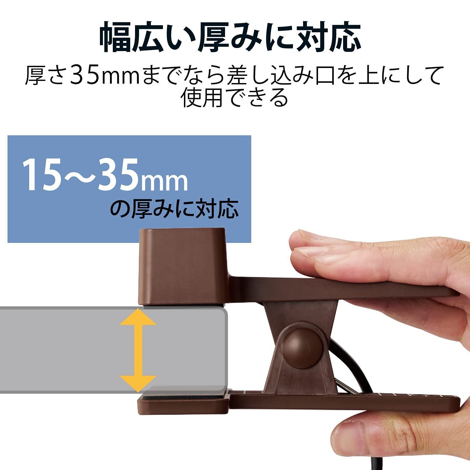 机などに挟んで利用することができるクリップ機構を搭載した2ピン式の3個口タップです。固定使用だけでなく、タップを常設できないダイニングテーブルなどでテレワークや宿題をする際に、一時的に設置して利用するのにも便利です。コードの長さは2.5mです。