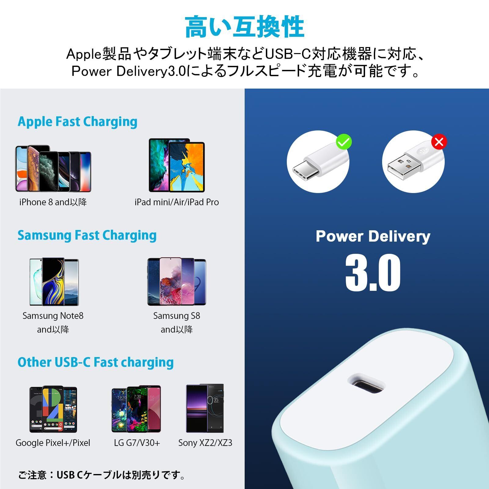 PD3.0 急速充電アダプター: Power Delivery 3.0の充電技術を採用して、Apple最新モデルiPhone8を始め、アップル純正の電源アダプターより3.5倍速く充電を実現できる20W USB C 充電器です。iPhone15へ僅か30分で55%までに充電できます。USB Power Deliveryとの互換性をさらに高めながら、Qualcomm Quick Chargeなどの充電規格にも対応し、より幅広い機器へのフルスピード充電が可能となりました。