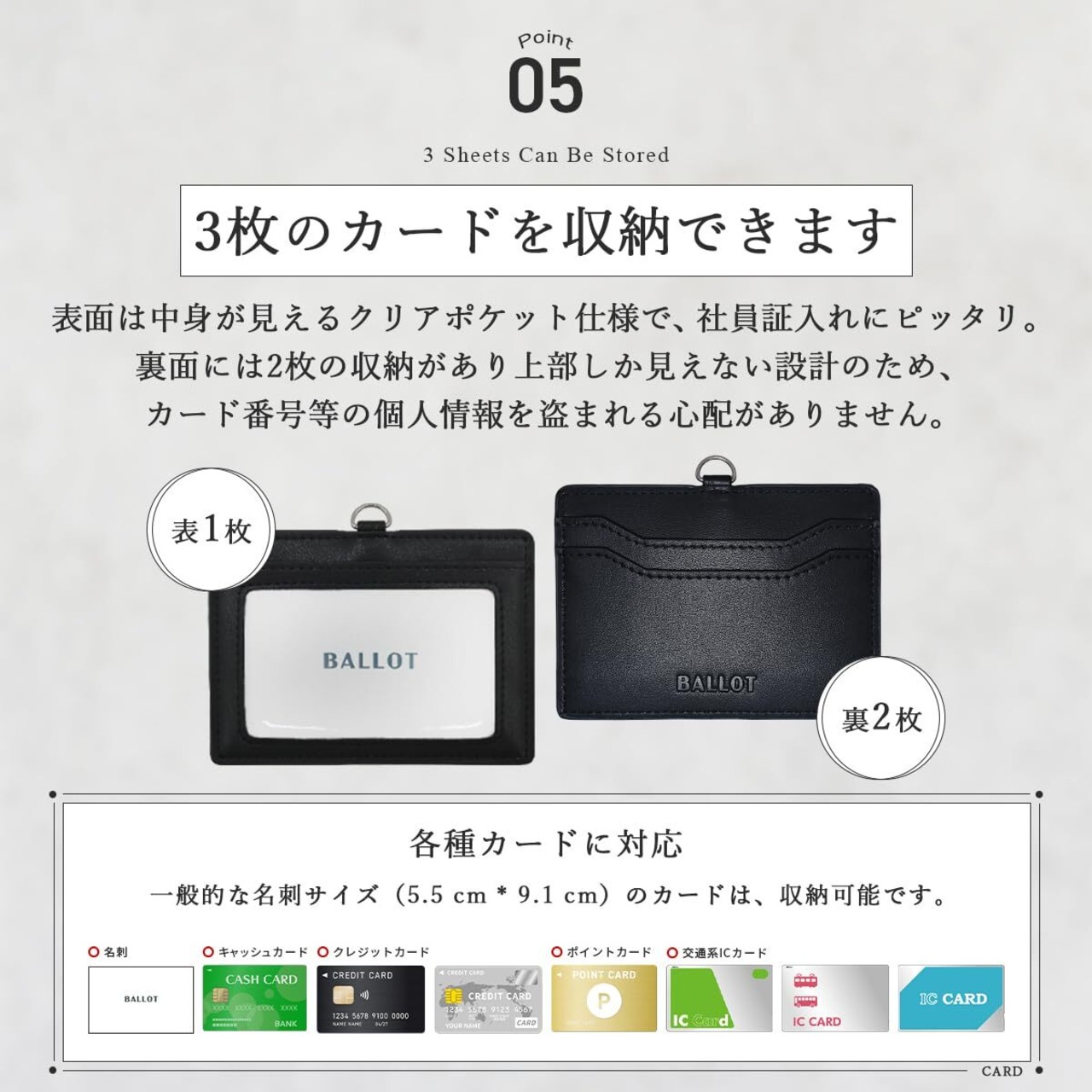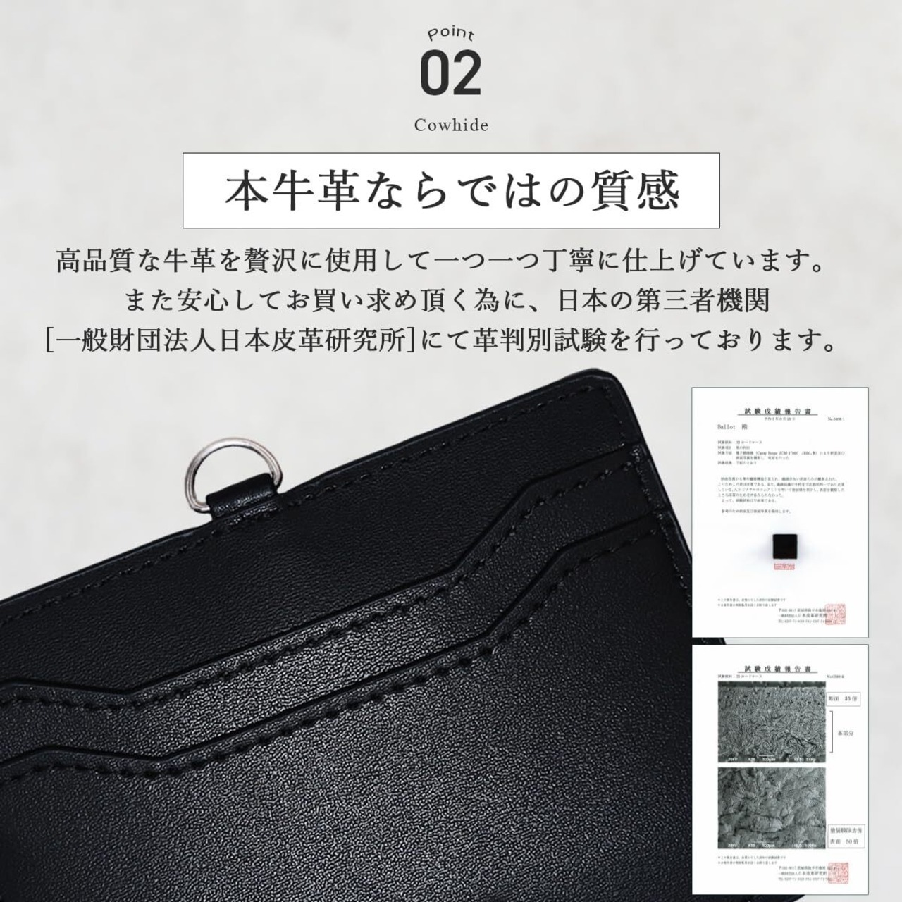 【本牛革ならではの質感】BALLOTのIDカードホルダーは、高品質な本牛革を使用し、一つひとつ丁寧に仕上げています。牛革特有の滑らかな手触りと耐久性が特徴で、長く愛用していただける一品です。さらに、日本の第三者機関「一般財団法人日本皮革研究所」にて革の判別試験を実施しており、品質の確かさが保証されています。洗練されたデザインと本革の上品な質感が、ビジネスシーンでの信頼感を演出します。