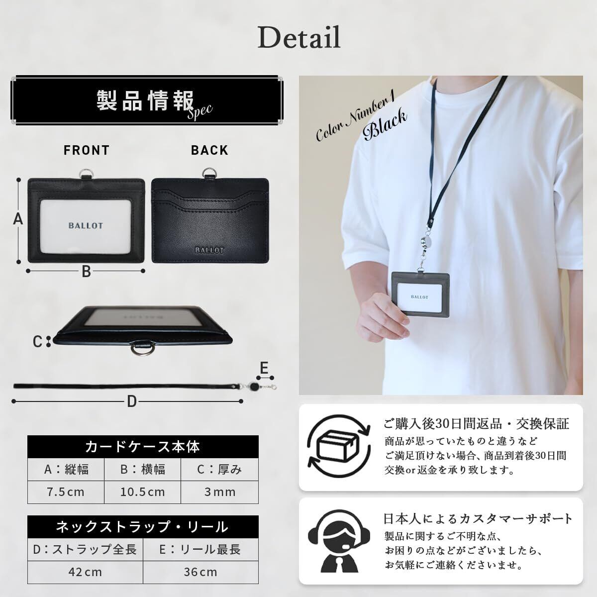 BALLOT [スーッと伸び〜る] 本革 IDカードホルダー ネームホルダー 横型 パスケース ネックストラップ 伸縮リール付き (ブラック)