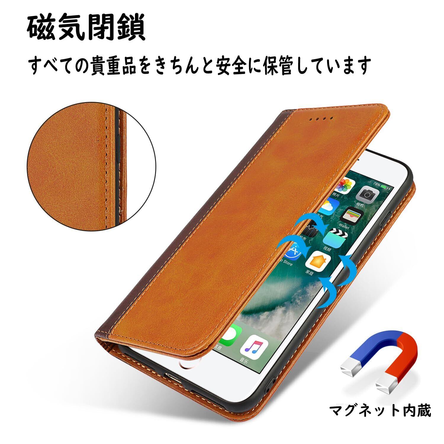 【収納機能】iPhone 7Plus/8Plusケース内側には三つのカード入れとフリーポケットがつき、カード類や紙幣、名刺などが収納できます。カードスロットに2枚のカードを入れると、内蔵マグネットの機能を最大限に発揮し、カードが消磁されるのを防ぐことができます。横置きスタンド機能が付き、横向いて斜めに立てて、自由に角度を調整して、お好みの角度で動画鑑賞や読書などを楽しめます。長時間での新幹線、飛行機の中での暇つぶしに最適です。