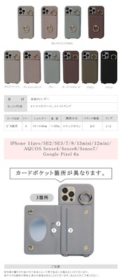 【商品特徴】■ショルダーストラップ付き ■マグネットなし ■カード収納4箇所があり ■ミラー付き ■スピーカー/充電ホール付き ■スタンド機能付き ■リング付き