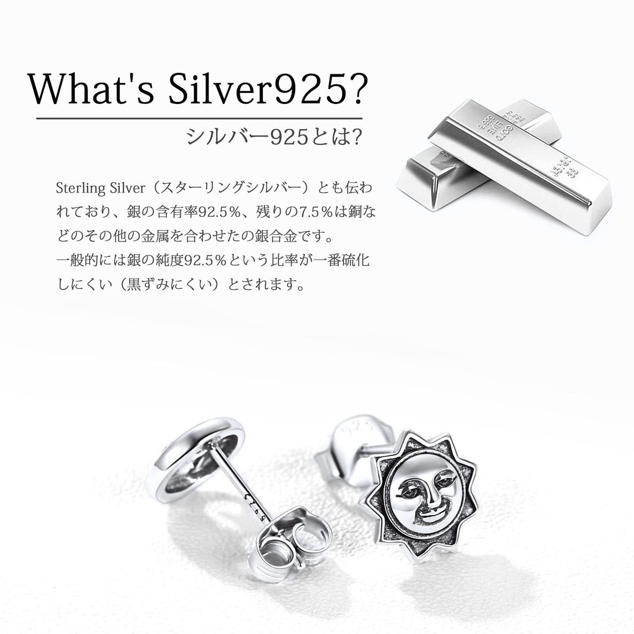 [シルバー925素材] 素材はシルバー925を使用しております。シルバー925素材はアレルギーが出にくくジュエリーとして加工しやすい点で大変優れた素材ですが、ご使用とともに輝きが落ちてきたなと感じた際にはシルバー用のジュエリークロスで磨くことをお勧めいたします。