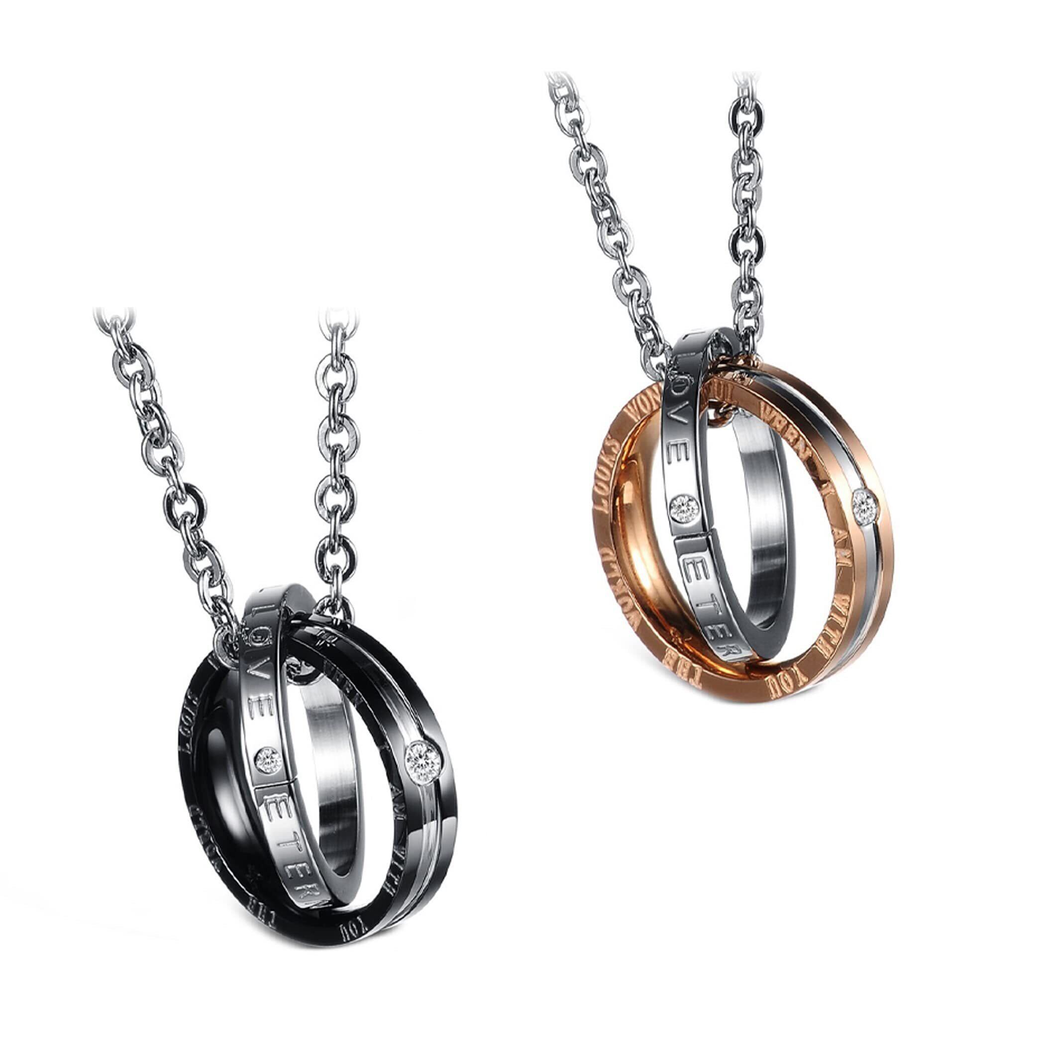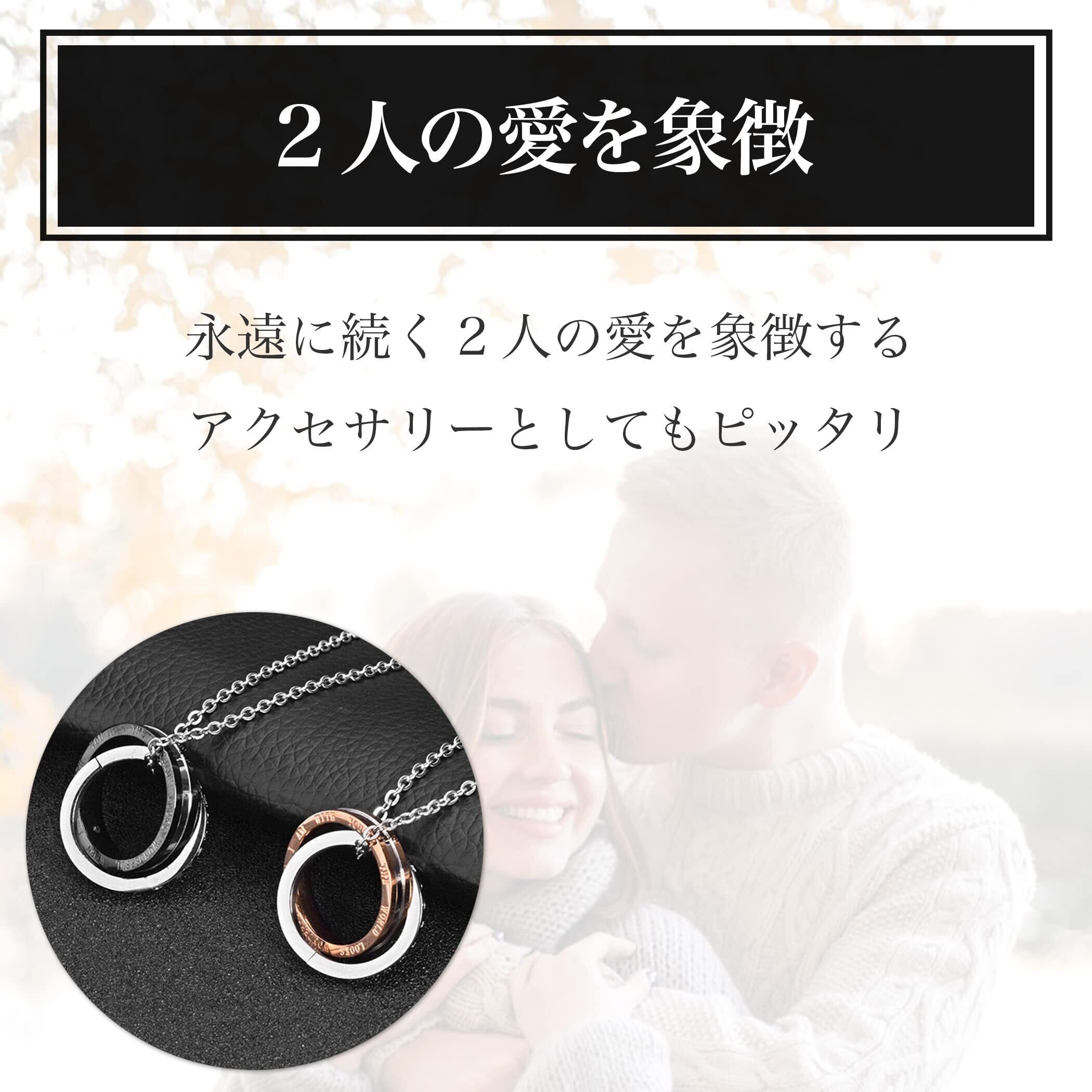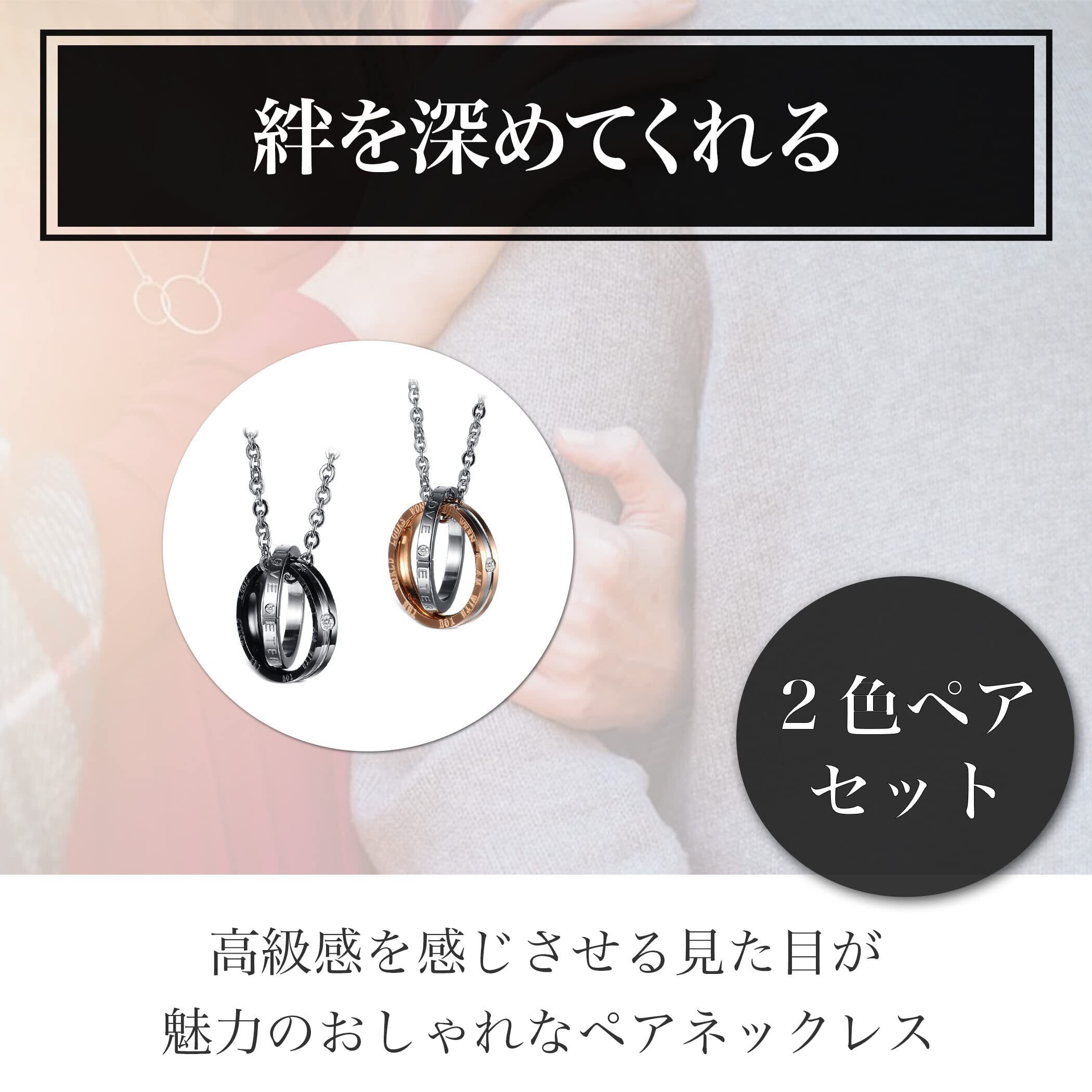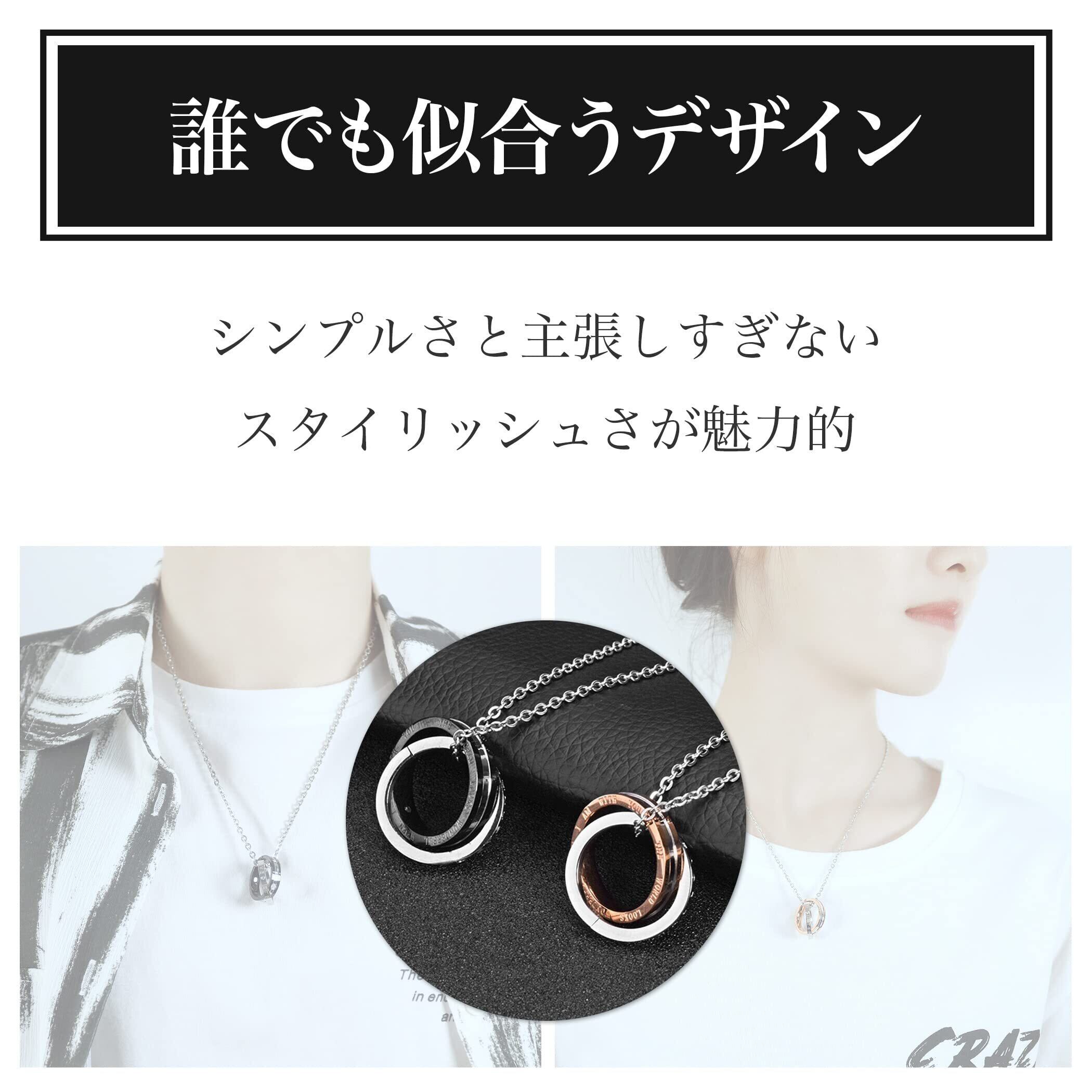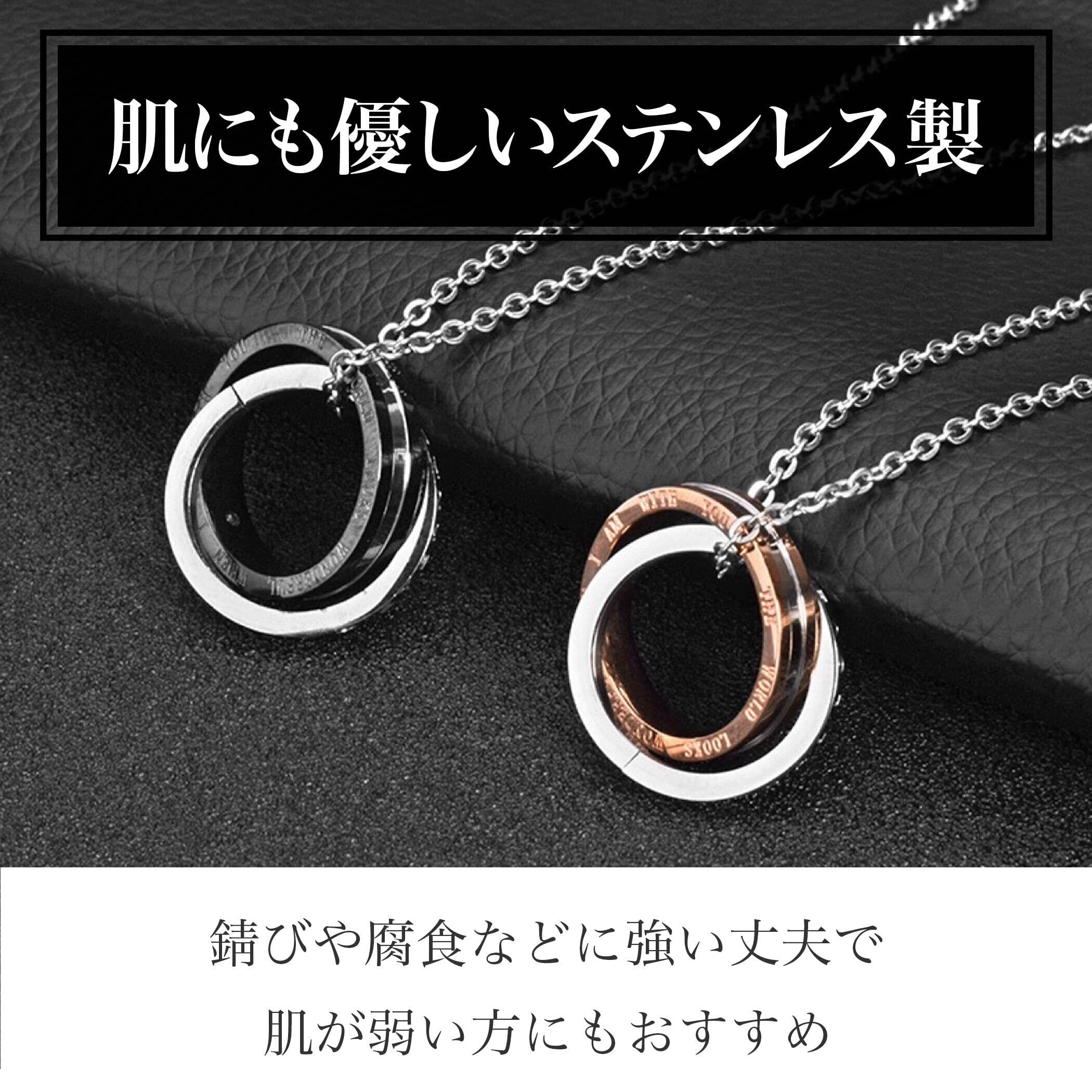 絆を深めてくれるおしゃれなペアネックレス:高級感を感じさせる見た目が魅力のおしゃれなペアネックレスです。身に着けるだけで、きっと2人の絆を深めてくれることでしょう。ブラックカラーのリングのネックレスが男性用、ローズゴールドカラーのリングのネックレスが女性用となっています。