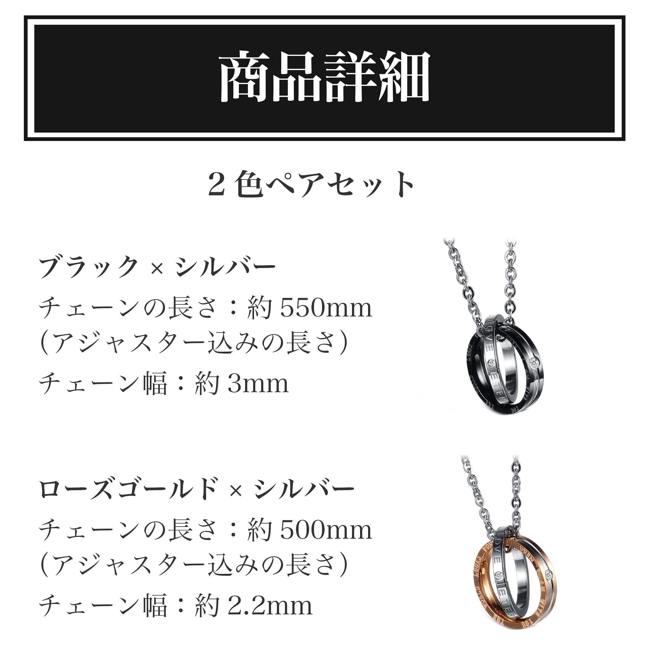 セット内容:2色ペアセット カラー:ブラック×シルバー(チェーンの長さ:約550mm(アジャスター込みの長さ) チェーン幅:約3mm)、ローズゴールド×シルバー(チェーンの長さ:約500mm(アジャスター込みの長さ) チェーン幅:約2.2mm) ※モニターの環境等により、色の見え方に若干差が生じる場合がございます。