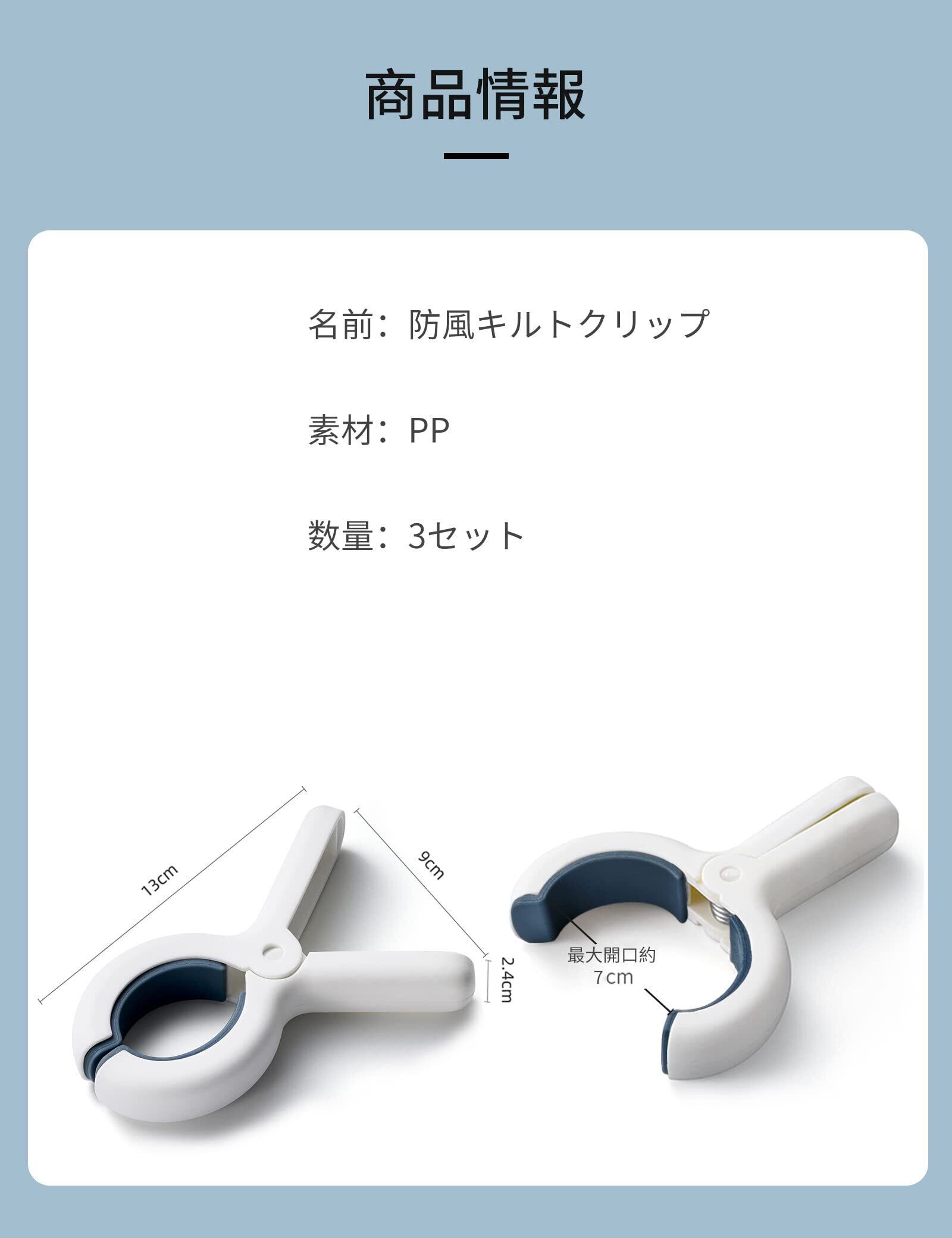 【大きいサイズ】クリップ開口部:7CM、長さ13CM、幅9CM。 クリップ数:3。 【跡を残さないデザイン】クリップの内側には、シリコンの滑り止めマットが取り付けられており、滑り止めだけでなく、服を挟んでも跡が残らない。 【強力スプリング】高弾性スプリング、クリップのクランプ力が大きく、防風効果が高く、屋外でも使用できます。 【多目的】寝具、シーツ、カーテン、衣類のグリップに。 【家庭・旅行】日常使い、家庭や旅行に最適です。 軽量で頑丈な構造で、どこにでも収納できます。