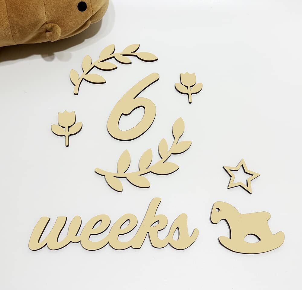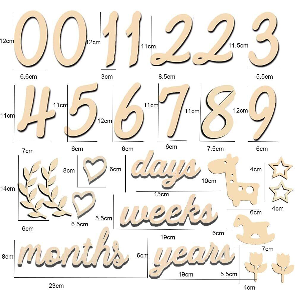 【セット内容】合計29枚セット、0*2枚、1*2枚、2*2枚、3~9各1枚、キリン*1枚、花*2枚、星*2枚、ハート*2枚、馬*1枚、days、weeks、months、years各一枚、合計27枚、サイズ:写真欄にご参照ください。素材:ウッド、厚さ:約3.6mm