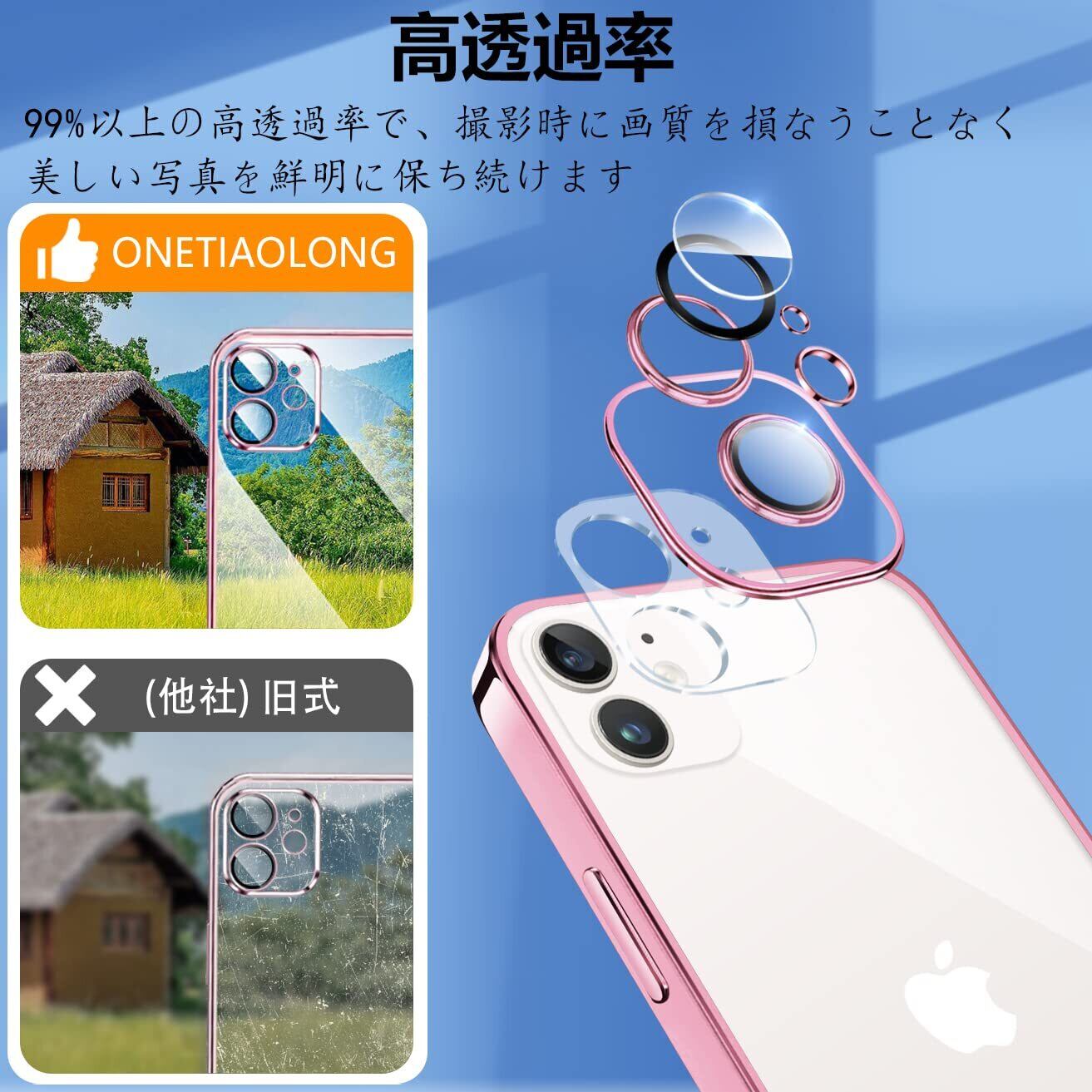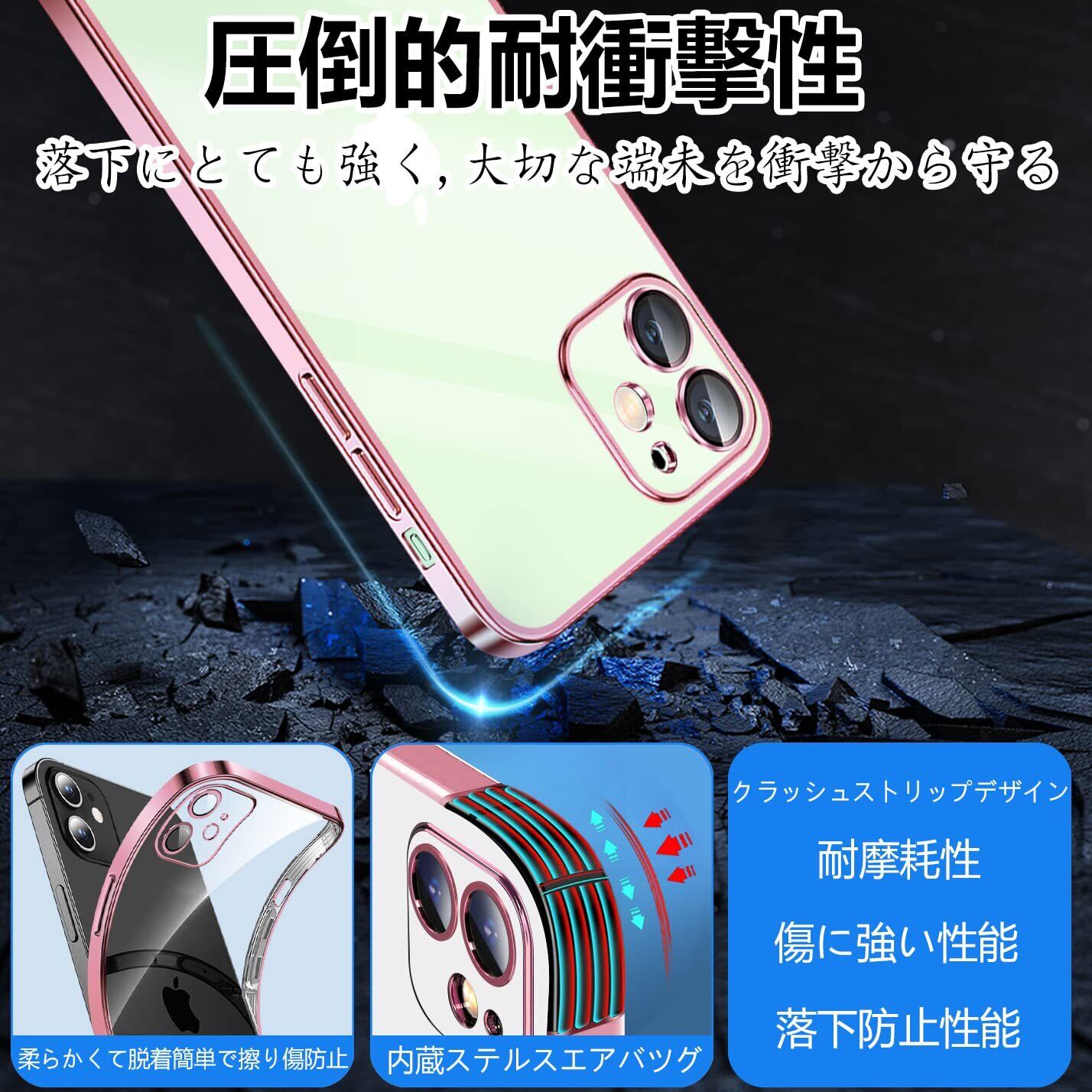 IPhone12 ケース クリア アイフォン12 レンズ保護 カバー 耐衝撃 透明 スマホケース 全面保護 軽量 メッキ加工 TPU 薄型 ストラップホール付き 滑り止め 落下防止 6.1インチ(ローズゴールド)