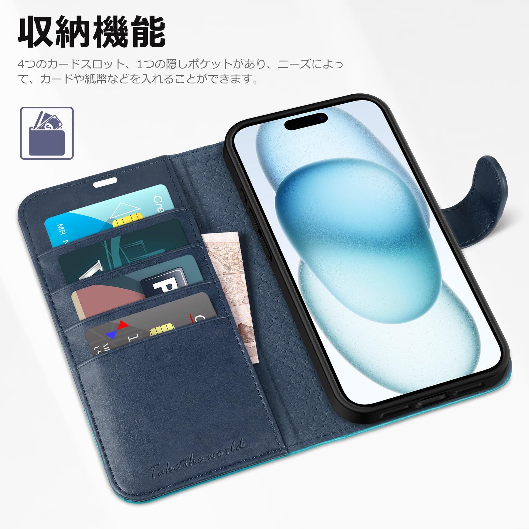 【多用性】①iPhone 15 ケースの内側に4つのカードポケットと1つの隠しポケットがあり、カードや小銭などを入れることが可能です。②横置きスタンド機能付き、異なる角度によって、液晶画面を横置きにして、動画視聴や読書の時など、いい楽しみになります。③スピーカーホール付き、蓋を閉じた状態でも通話可能、操作性を活かす。