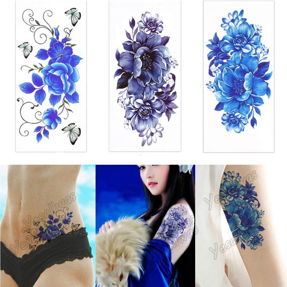 【在庫セール】Yesallwas タトゥーシール 薔薇 青 ブルー 花 8枚セット 紫 バラ ロース おしゃれ 防水 長持ち 入れ墨シール 腕 足 胸 女性 レディース タトゥーステッカー ボディーシール 刺青シール blue Rose tattoos sticker 9x19cm (青) | ニコニコSHOP