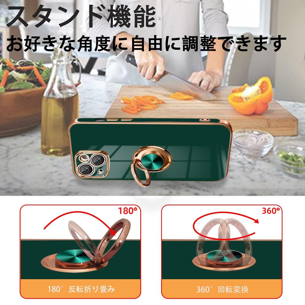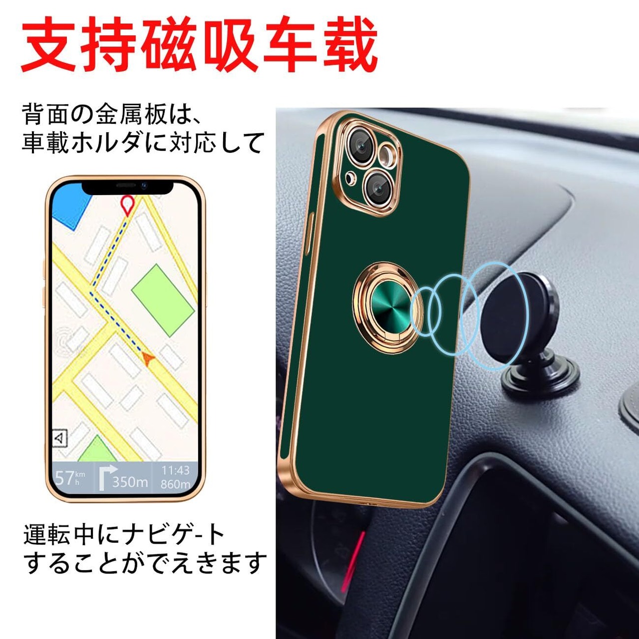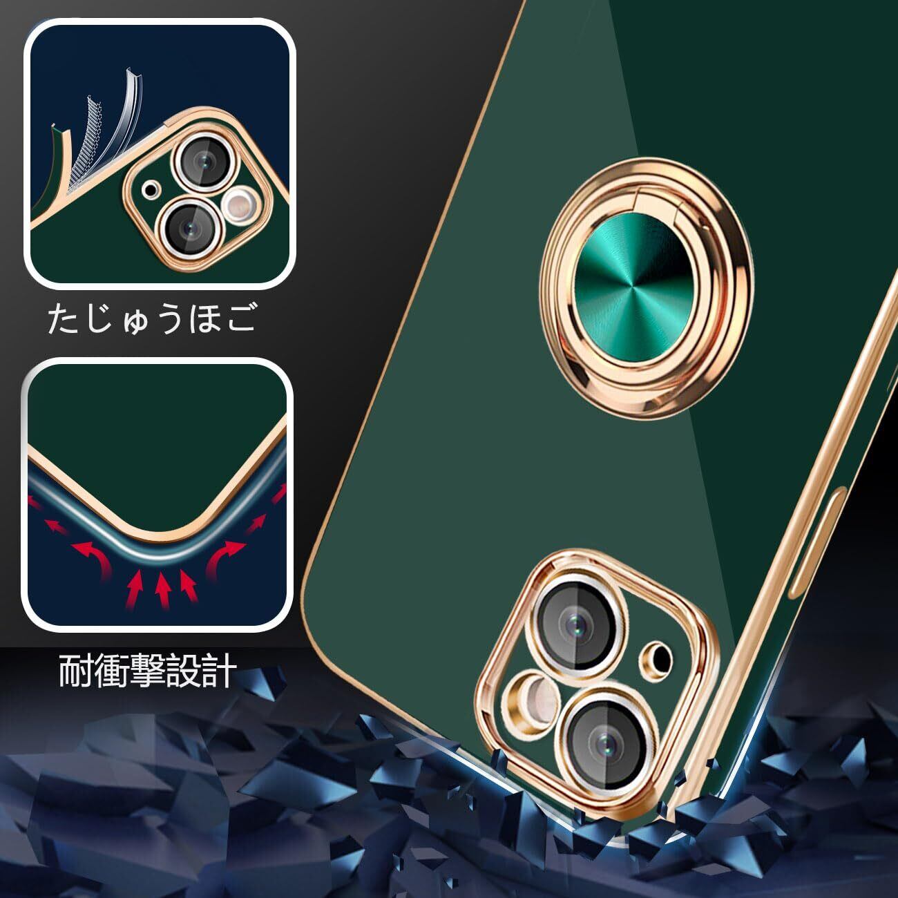 KEHUALLE iPhone 14 ケース リング付き スマホケース いphone 14 ケース 耐衝撃 メッキ加工 TPU カバー 車載ホルダー対応 360度回転 多機能 スタンド機能 ストラップホール付き アイフォン 14 ケース 6.1 インチ用 (ダークグリーン)