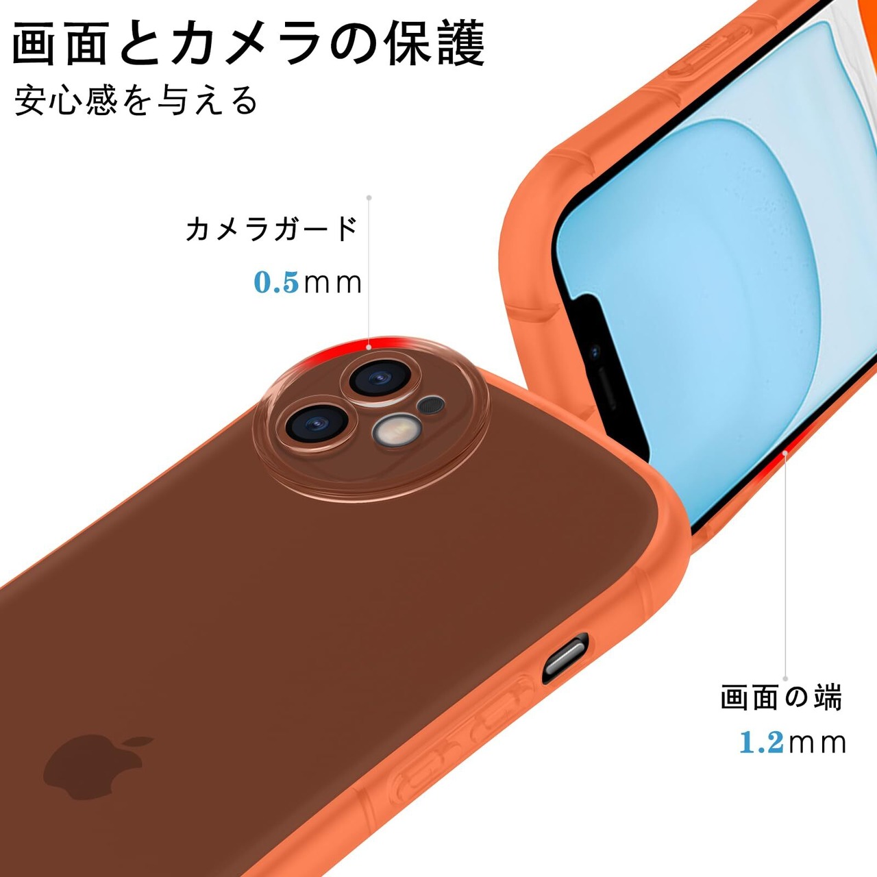 【液晶画面・カメラレンズ保護】液晶画面より1.2mm高め、併用のガラスフィルムまでも保護できます。背面側はカメラレンズより0.5mm高め、机などの平面に置いても傷付く心配はありません。