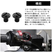 【機能】ミラー穴を密閉するアルミ製スクリューキャップ。バーエンドミラーを取り付けた場合には、元のミラーの穴に水を溜め錆になったり、ほこりや砕石等で詰またりすることがあります。これらのネジを使用したら、簡単にその問題を解決できます。同時に、オートバイを飾ます。