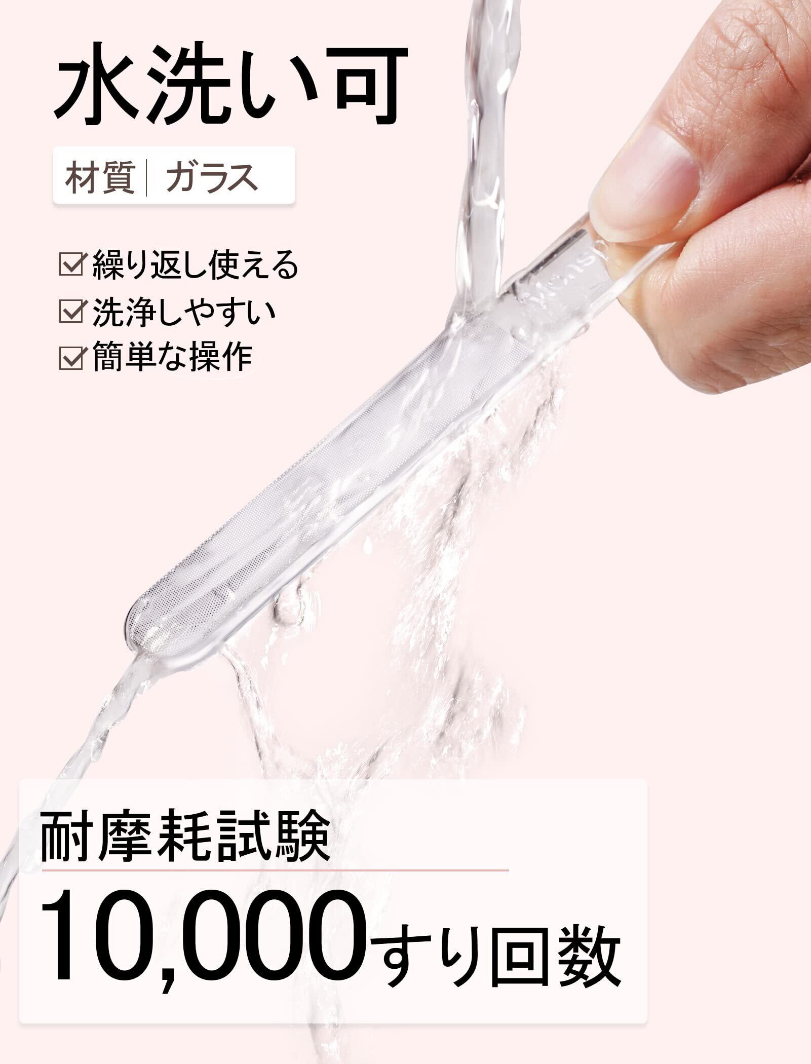 【プロネイリスト推薦】爪やすりは樹脂製で、割れないようにする、繰り返し使うことができ、鉄制の爪やすりのように錆びたり、スポンジ制の爪やすりのように壊れたりしません。そのため、ガラス制の爪やすりは他の材料で作る爪やすりよりも長く使うことができ、環境に優しいのです。使用后は、流水で洗って乾かせばok!