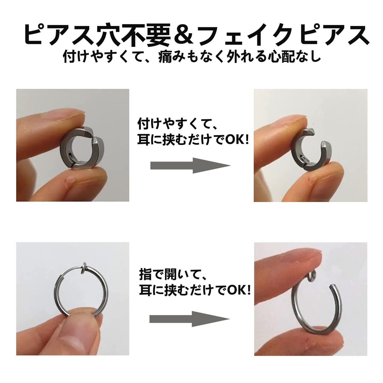 【脱着しやすい】バネタイプなので、イヤリングの開き具合を自分で調節できるので痛くもなく外れる心配もなく、手軽にオシャレを楽しみたい方にオススメです。留め具もないので前から見ても後ろから見ても普通のピアスと変わらないフープピアスを装着しているようにみえます。イヤリングセットはスプリングタイプが4ペア、直接挟むタイプが2ペアあり、2種類を自由に組み合わせて付けてもオシャレです。